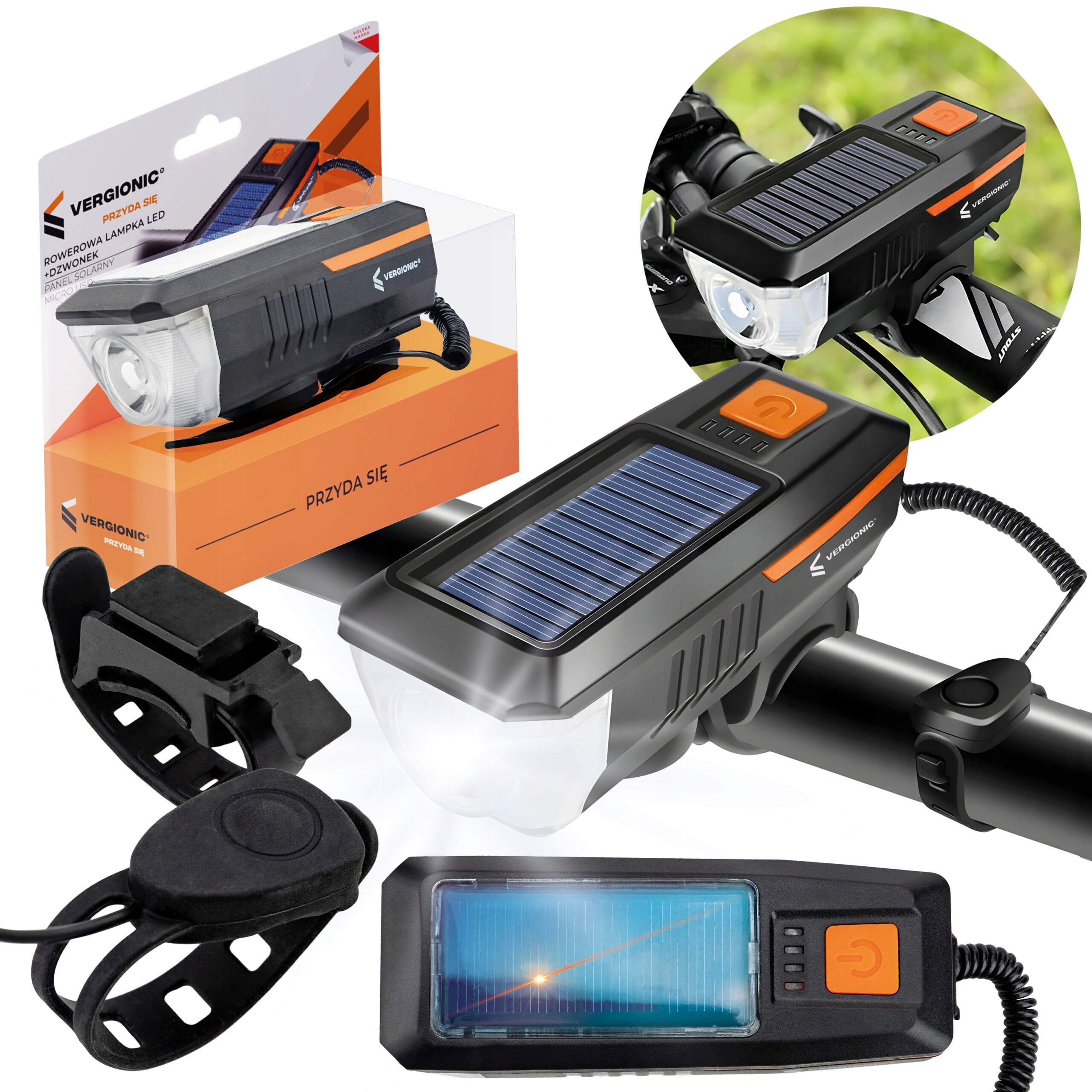 Світлодіодний велосипедний ліхтар заряджається за допомогою microUSB або через сонячну панель, встановлену на ліхтарі, що дозволяє заряджати його екологічно та без необхідності використання додаткових джерел енергії в дорозі. Крім того, ліхтар оснащений гучним дзвінком з 5 різними мелодіями, який дозволить попереджати інших учасників дорожнього руху про вашу присутність.
