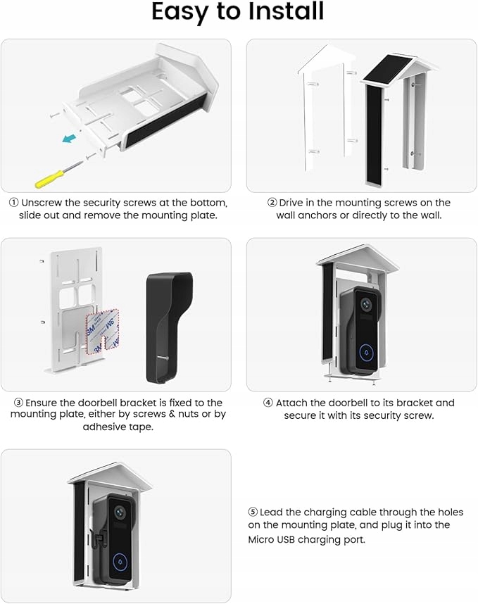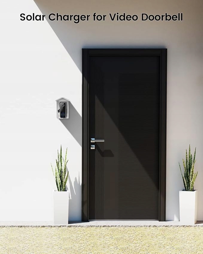 - Водонепроникний, ексклюзивний дизайн: сонячний зарядний пристрій для відеодомофона виготовлено з високоякісних водонепроникних матеріалів, сонячний зарядний пристрій може протистояти снігу, бурі, дощу та іншим суворим погодним умовам. Ідеально підходить для всіх дверних дзвінків або зовнішніх камер із портом Micro USB