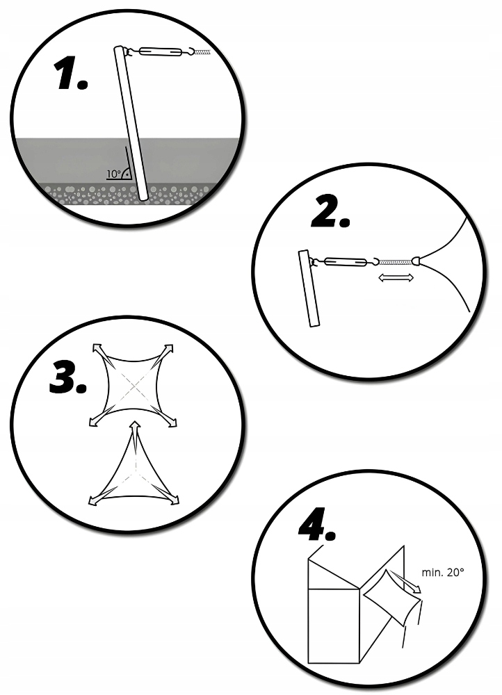 Для отримання оптимального та стабільного натягу напрямок витягування завжди має бути діагональним від кута до кута. Це забезпечує дренаж води та запобігає утворенню водяних кишень. Наші вітрила дозволяють різні способи складання та конфігурації.
