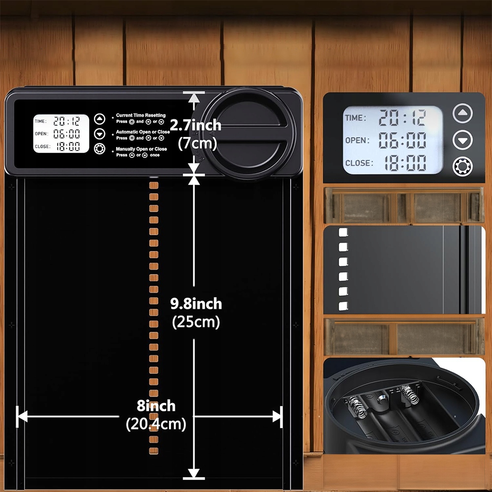 Автоматичні двері курячого курога оснащені інтегрованим РК -екраном, що дозволяє легко та точно регулювати час відкриття та закриття. Установка проста і може бути зроблена без складної електричної установки.