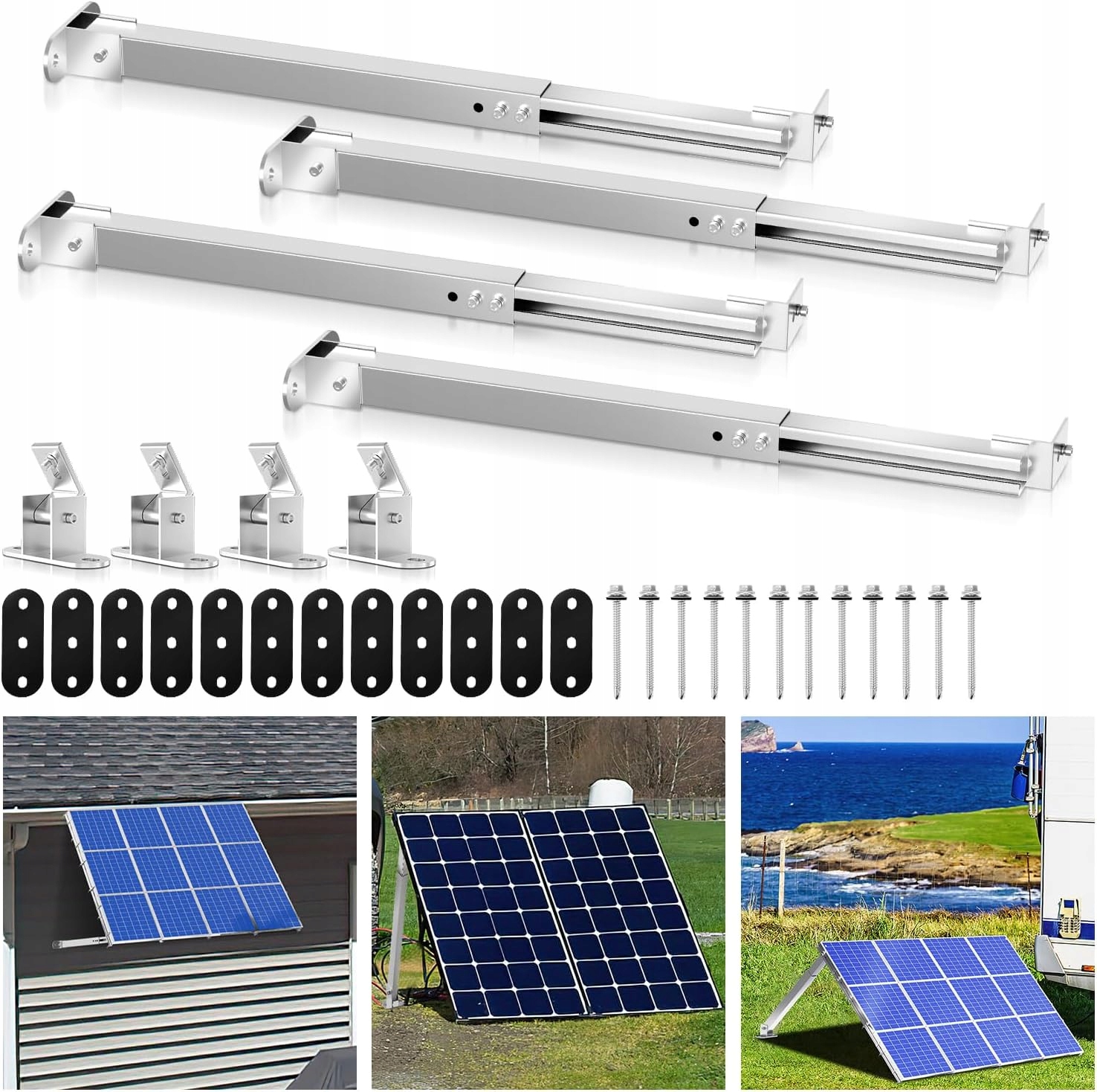 - Широкий діапазон застосувань - тримач сонячних модулів можна швидко та безпечно встановити на плоских дахах, гаражах, балконах і балконних поручнях, укриттях для автомобілів, стінах, човнах, кемпінгах і караванах.