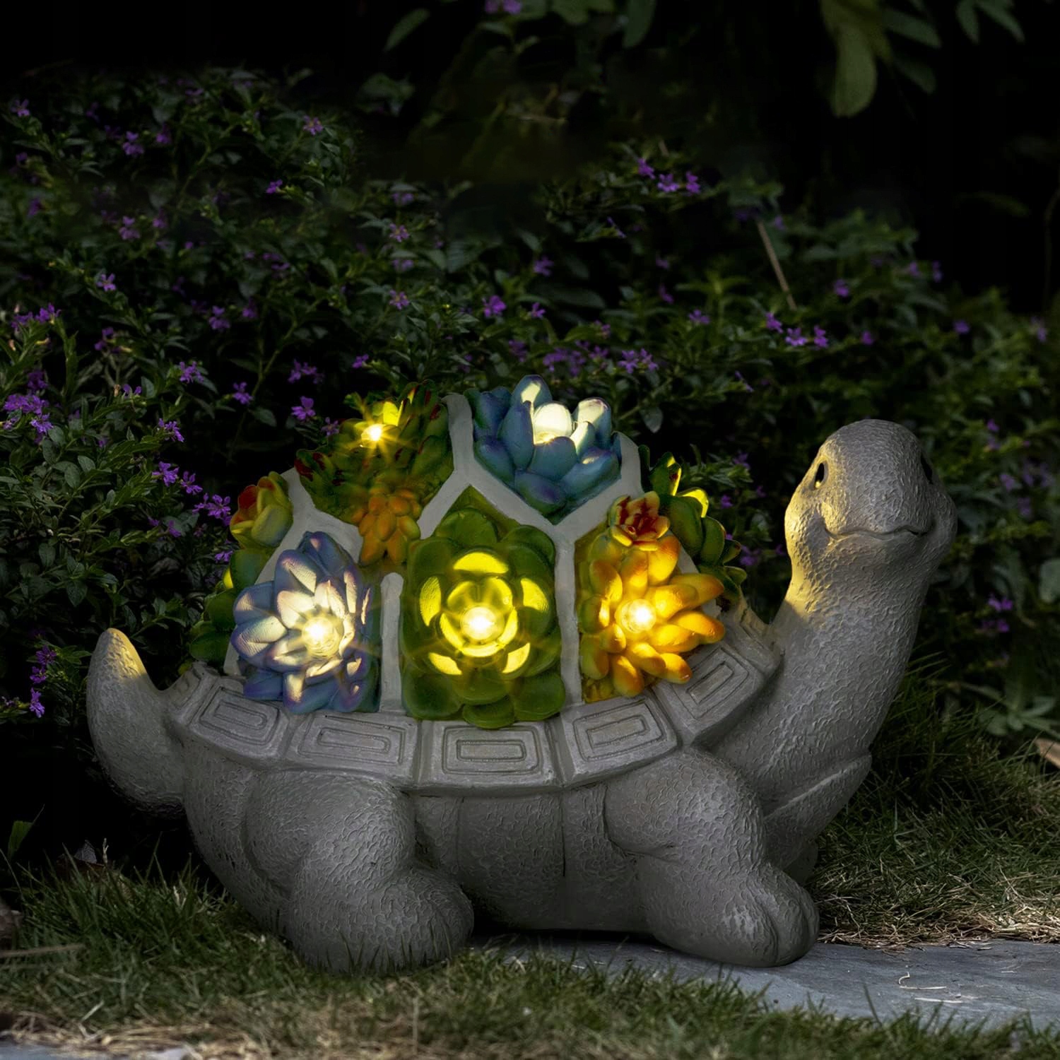 Ця чарівна черепаха смоли має на одній стороні кольорову, сонячну лампу у формі соковитої та на іншій сонячній панелі. Це буде чарівне доповнення до вашого саду чи кімнати та дасть вашому дому радісний персонаж.