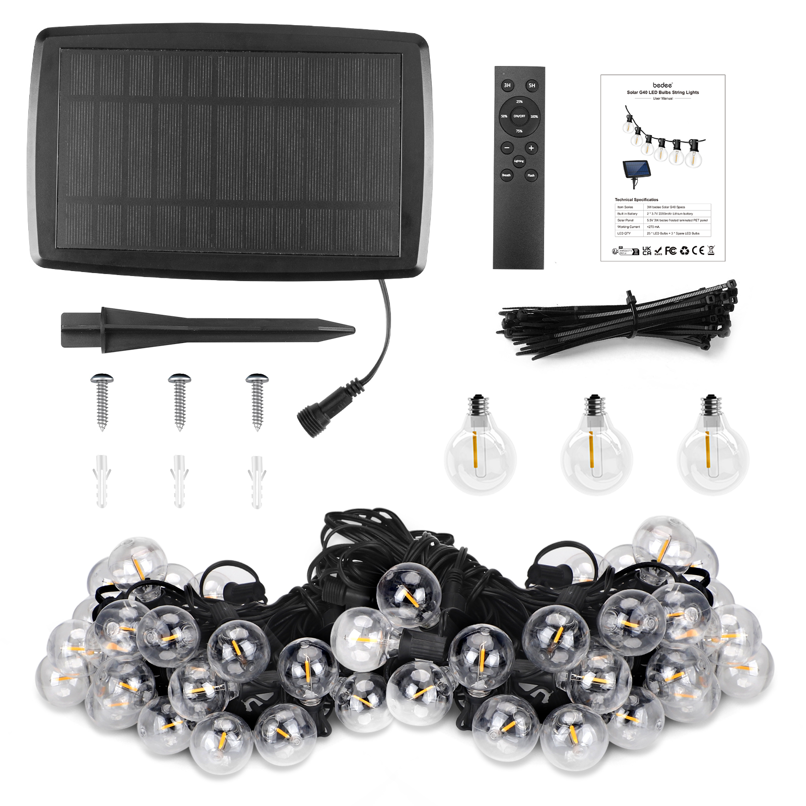 Загальна довжина становить 15,2 метра, оснащена 25 світлодіодними лампочками, 3 лампочки та 30 чорних кабельних діапазонів, забезпечуючи достатнє освітлення в різних умовах.