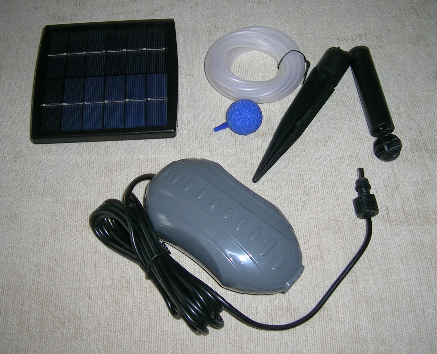 Ідеально підходить для ставків з рибою, де вміст кисню знижується особливо влітку при високих температурах. Насос розміщується поза водою і працює незалежно від електричної мережі за допомогою сонячної панелі під прямим сонячним світлом. За допомогою силіконового шланга довжиною 2 м і повітряного каменю в ставок накачується кисень. Сонячна панель має багатофункціональний шип, за допомогою якого її можна розташувати, вбити в землю та направити через кульовий шарнір до сонця.