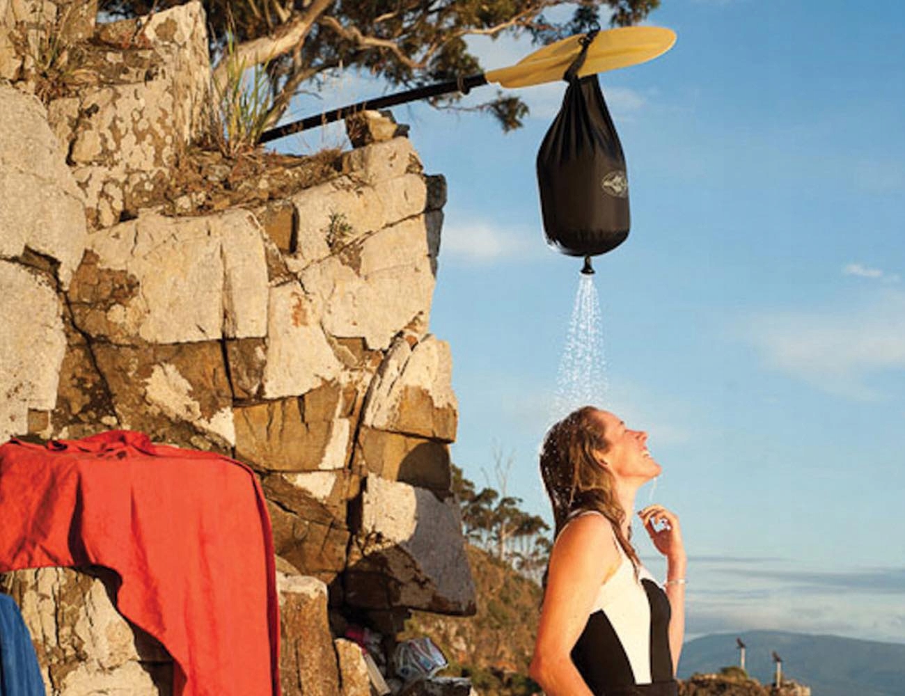 Душ австралійської компанії Sea to Summit виготовлено з водонепроникного нейлону 70D із застібкою. Чорний колір матеріалу поглинає сонячне світло, тому вода нагрівається швидше.