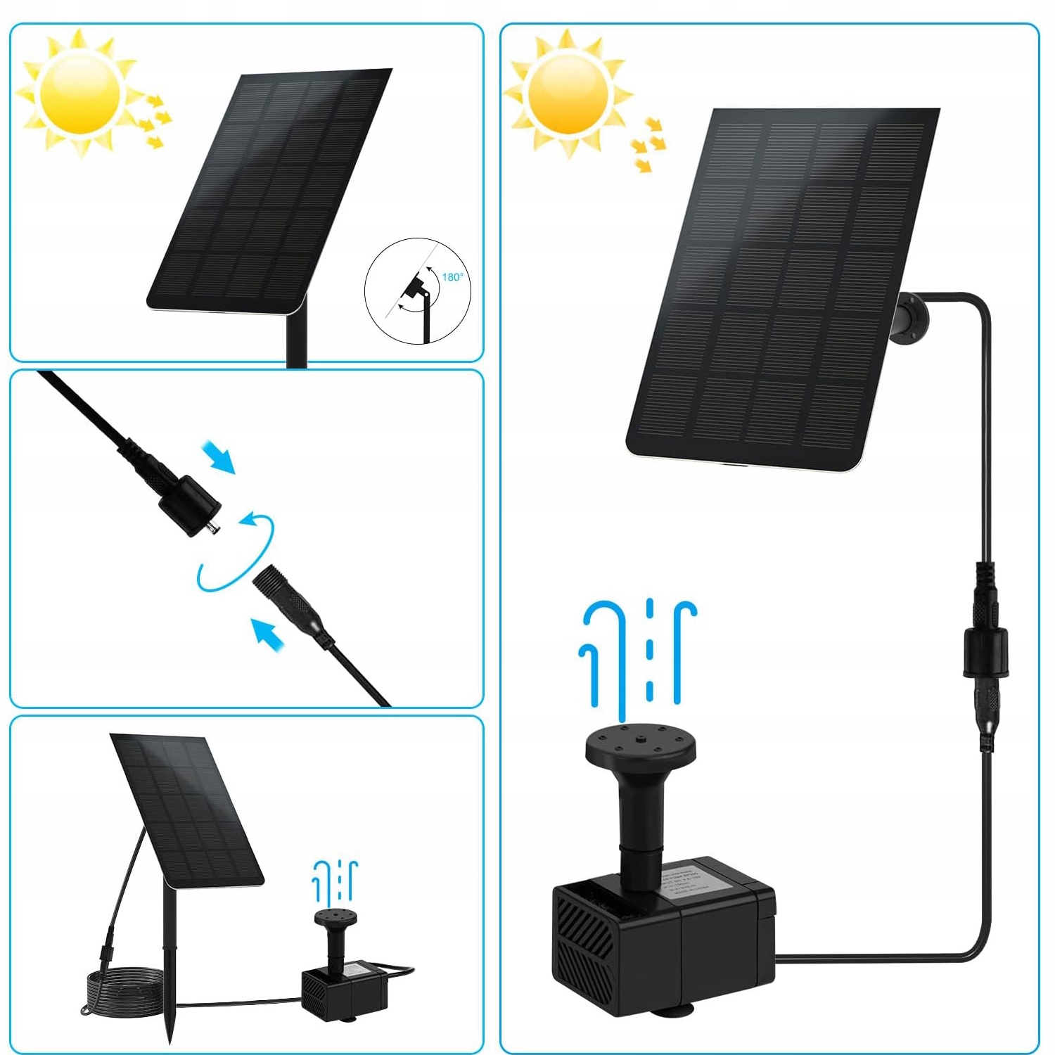 🔆 насос сонячного фонтану повністю контролюється за допомогою сонячного суглобового насоса і не потребує акумулятора або електроенергії. Просто покладіть насос у воду, покладіть сонячну панель на прямі сонячні промені і працюватиме автоматично. Він також може працювати від USB, що може ефективно вирішити проблему низького потоку води при низьких сонячних променях і зазвичай може використовуватися навіть у похмурі дні. Постійно переробляла воду.