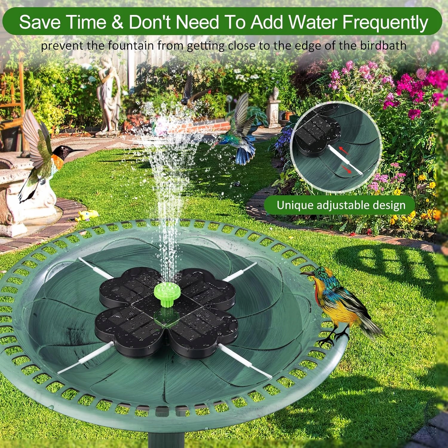 Прості у використанні: не потребує акумулятора чи електроенергії. Цей водяний насос подається лише сонячною енергією і безпечний у використанні, не піддаючи користувачів будь -якій небезпеці. Для підтримки чистоти воду слід часто змінювати. Щоб забезпечити оптимальну продуктивність, підтримуйте чисту поверхню панелі сонця. Запропонуйте прохолодний напій або швидку ванну для птахів у саду, не завдаючи їм шкоди