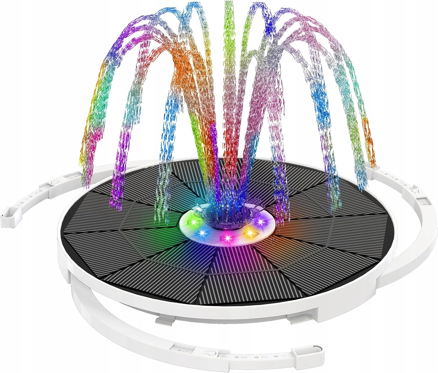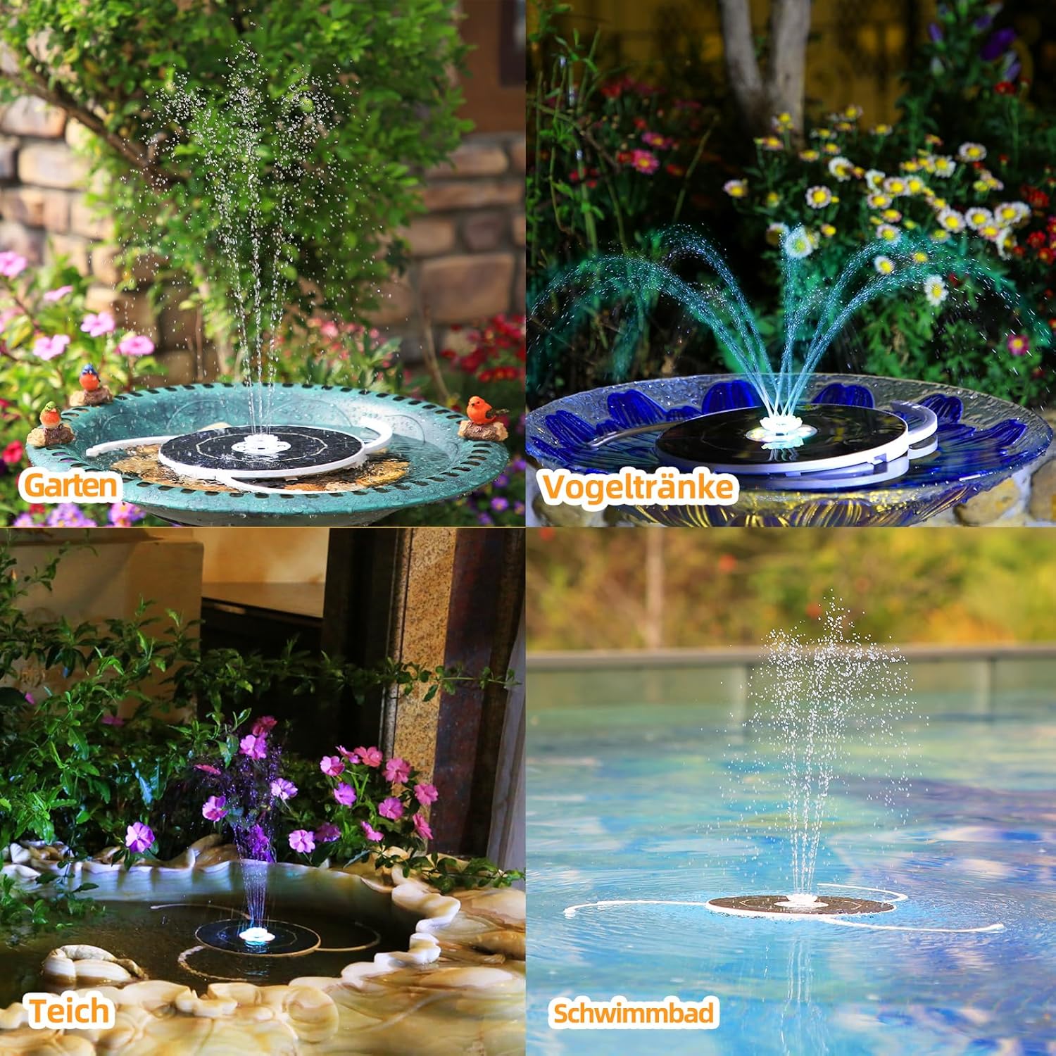 - 8 світлодіодів і сонячний фонтан з акумулятором 3000 мАг з акумулятором 3000 мАг, який може зберігати енергію під час прямого сонячного світла протягом дня. Накопичена електроенергія може зробити фонтан автоматично розпорошувати воду і блищати вночі до 5-6 годин. 8 барвистих світлодіодів з високою яскравістю зроблять ваш сад красивішим вночі.