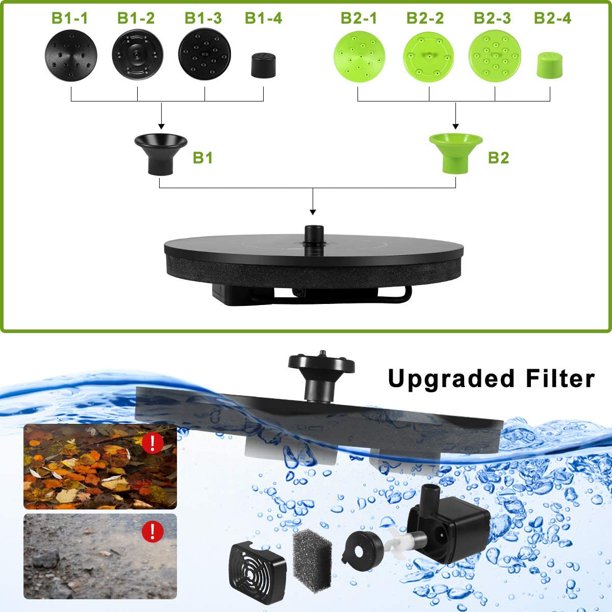 Фонтани на сонячних батареях: насос для купання птахів на сонячних батареях працює під прямими сонячними променями. Він повністю працює на сонячних батареях. Не потребує батарейок або електрики. Це екологічно чистий сонячний насос, який економить ваші гроші.