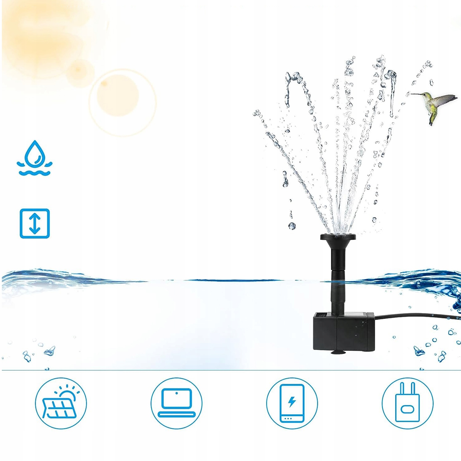 сонячно і працюватиме автоматично. Він також може працювати від USB, що ефективно вирішує проблему низького потоку води з низьким сонячним світлом і зазвичай може використовуватися навіть у похмурі дні.