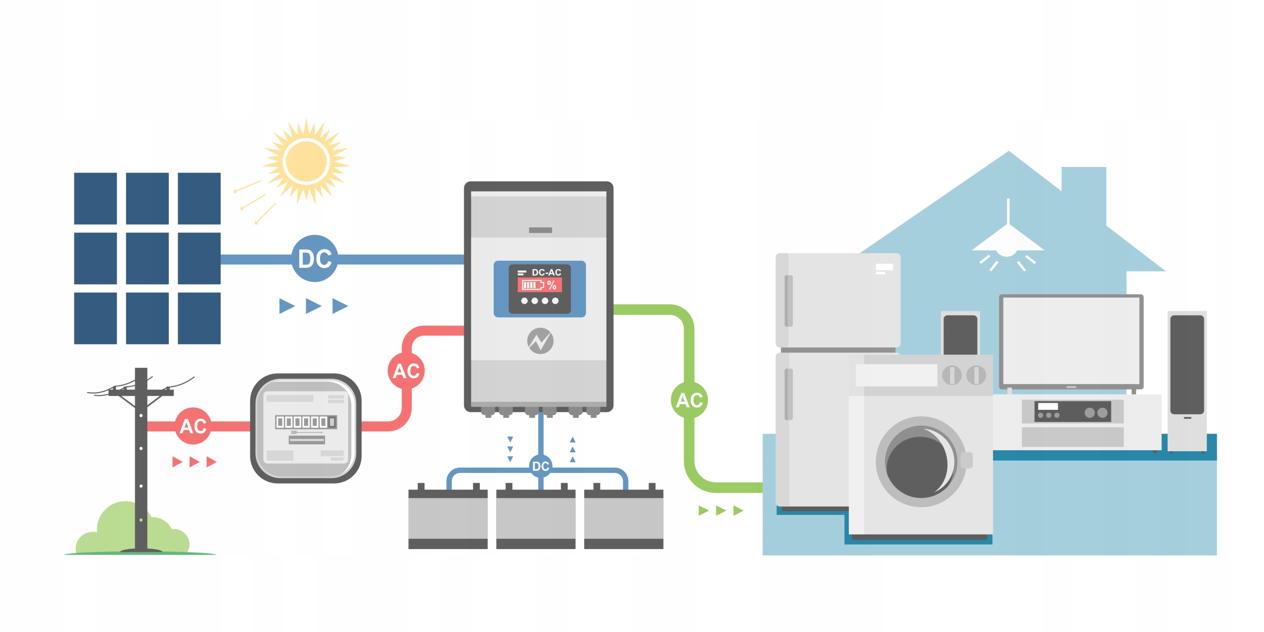 Омрежевий гібридний інвертор, поєднує фотоелектричну установку, накопичувач енергії і електромережу. Протягом дня він заряджає накопичувач енергії від фотоелектричних панелей. Потім ця енергія живить домашні прилади за рахунок енергії, накопиченої протягом дня, а після того, як батарея розрядиться, вона бере енергію з мережі.