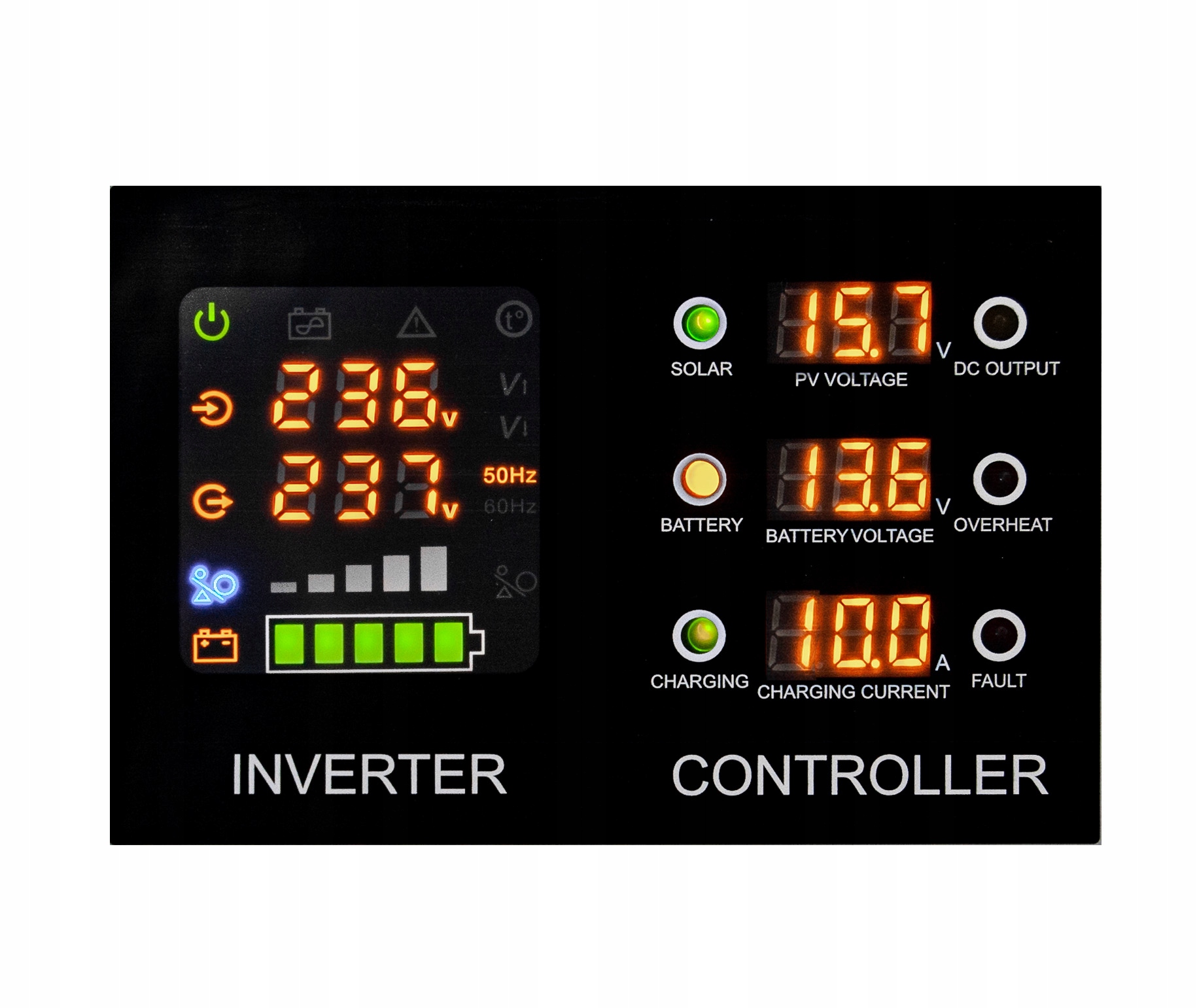 - РК-дисплей показує поточну напругу мережі, стан заряду батареї, напругу та струм від фотоелектричних панелей.
