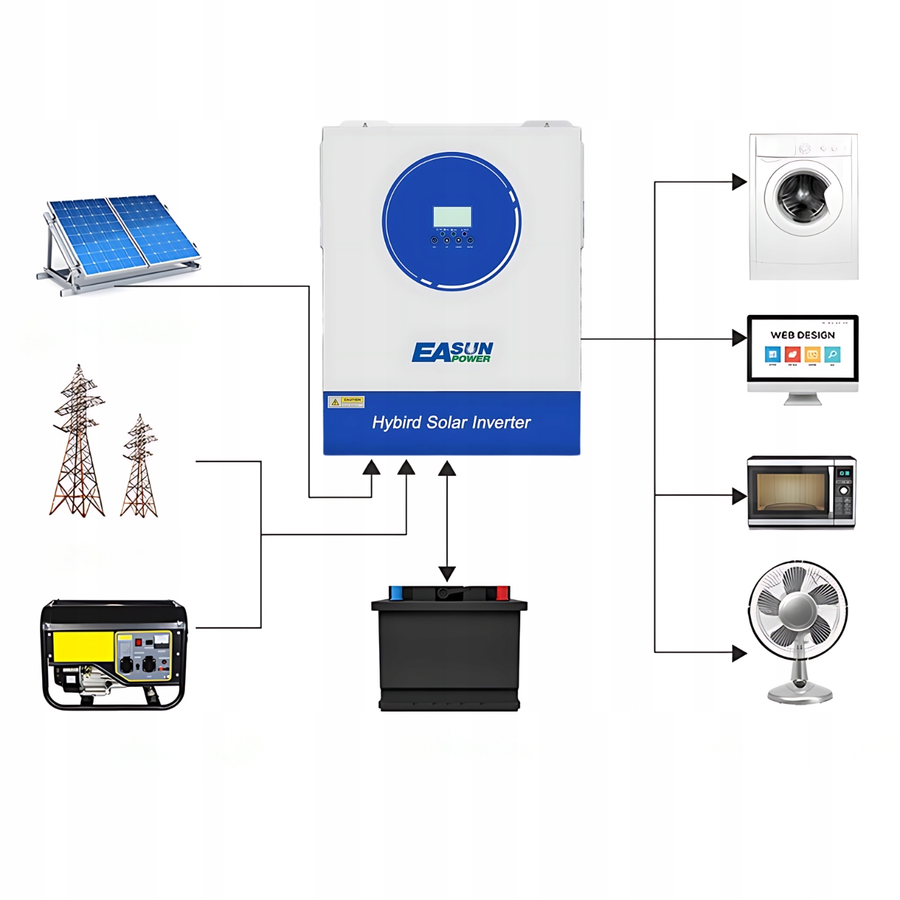 Інвертор Easun Power потужністю 11 кВт характеризується здатністю працювати без акумуляторів і підтримує кілька вихідних пріоритетів, таких як SUB, SBU та SUF. Додаткові функції, як-от оптимізація продуктивності акумулятора за допомогою еквалайзера, подовжують термін служби системи та підвищують ефективність.