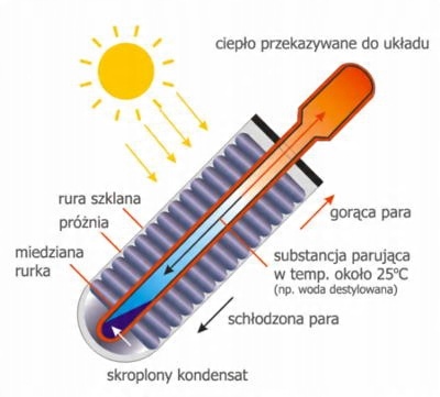 Під впливом сонячного світла внутрішня частина вакуумних трубок нагрівається. Тепло передається до «теплових трубок» через алюмінієві радіатори. При досягненні температури 25 ºC рідина в «теплової трубі» почне кипіти, перетворюючись на пару. Пара швидко піднімається до головки теплообмінника, де виділяє тепло, охолоджується та знову конденсується. Потім він знову потече по «тепловій трубі», щоб повторити весь процес. Високий ККД колектора обумовлений здатністю поглинати розсіяне сонячне випромінювання (наприклад, у похмурі дні) і максимальним зниженням тепловтрат. Енергія отримується не лише від прямого сонячного світла, але й від світла, відбитого від снігу.
