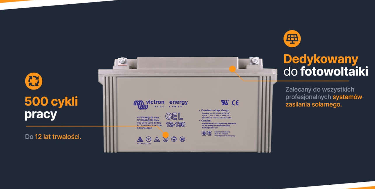 Усі гелеві акумулятори Victron Energy мають найвищу світову якість, призначену для професійних сонячних систем, що працюють на островах. Батареї VE забезпечують дуже високу ефективність у поєднанні з довговічністю до 12 років. Голландська компанія Victron Energy, відома своїм професійним підходом до систем відновлюваної енергетики, пропонує продукцію, яка на клас вище звичайних гелевих акумуляторів. Вирішивши придбати дану серію товарів, ви обираєте стабільність і безвідмовну роботу на роки. Гелеві акумулятори відрізняються високим ККД при низькому струмі розряду. У такій ситуації вони можуть випустити більше вантажу, ніж вони номінально накопичили. Ми рекомендуємо гелеві батареї Victron Energy для всіх професійних систем сонячної енергії.