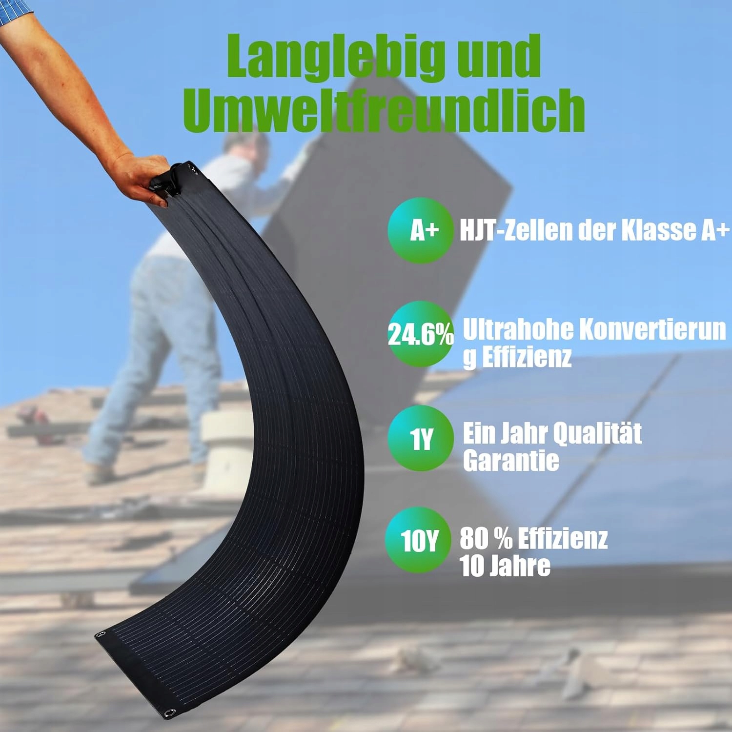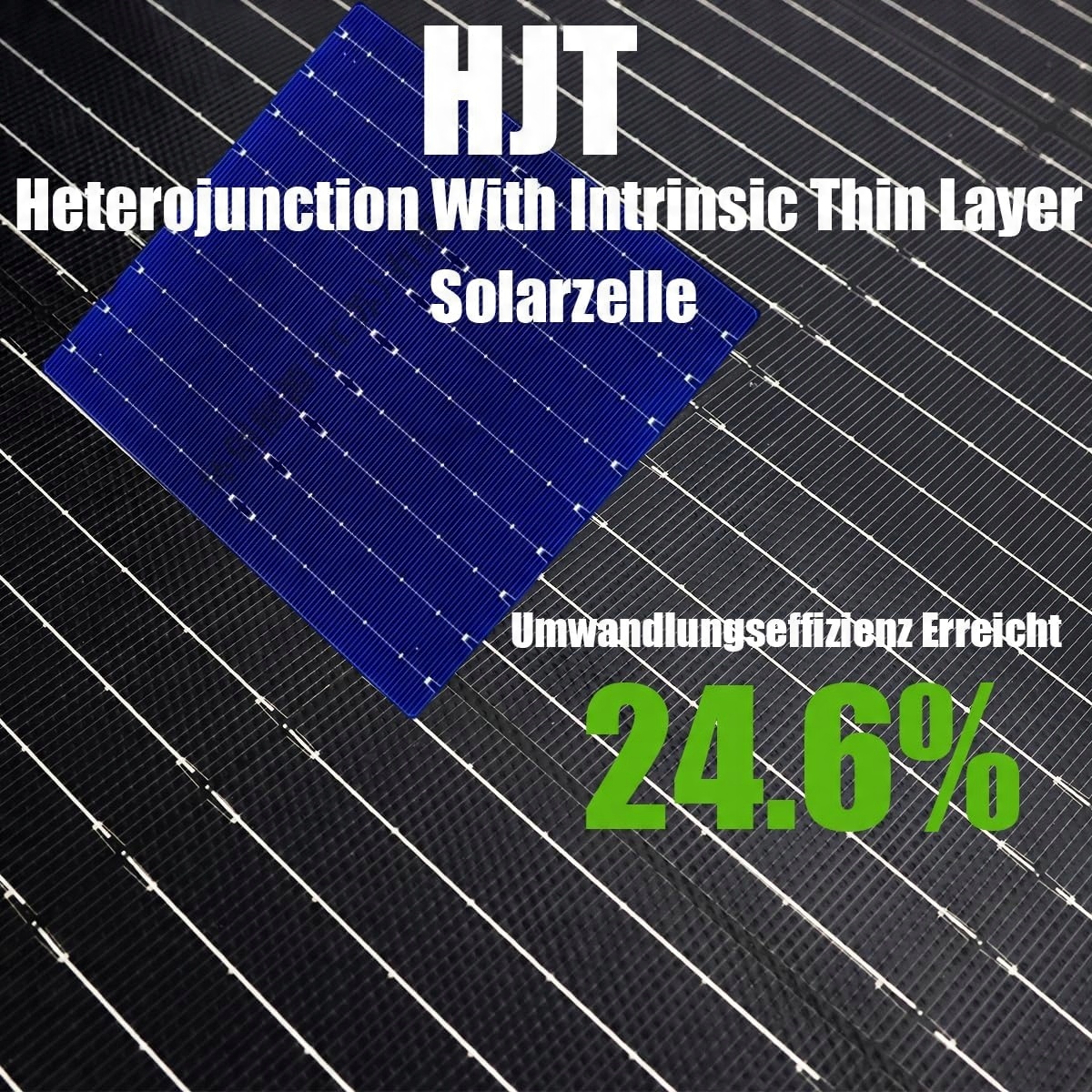 【Високоякісний матеріал】 Завдяки інноваційній технології HJT Solar Panels досягає 24,6%конверсії. Поєднання кристалічного та аморфного кремнію перетворює більше фотонів у електроенергію і зменшує втрати. Сонячні клітини HJT перевищують традиційні полікристалічні клітини та забезпечують високу ефективність та енергоефективність. Гнучкі сонячні модулі HJT надзвичайно ефективні.