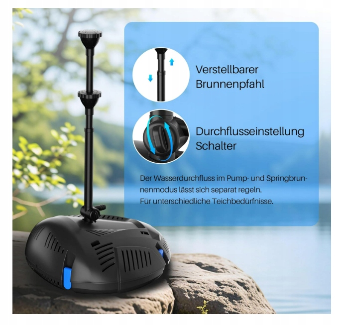Система біологічної фільтрації ефективно очищає воду, зменшуючи водорості та покращуючи умови життя риб. Насос має продуктивність до 2100 л/год, що робить його ідеальним для ставків об’ємом до 4000 літрів..
