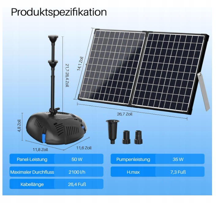 Насос працює від скляної сонячної панелі потужністю 50 Вт і працює повністю екологічно. Завдяки довгому кабелю 5 м його можна встановити в будь-якому місці саду, де він матиме доступ до сонячного світла.