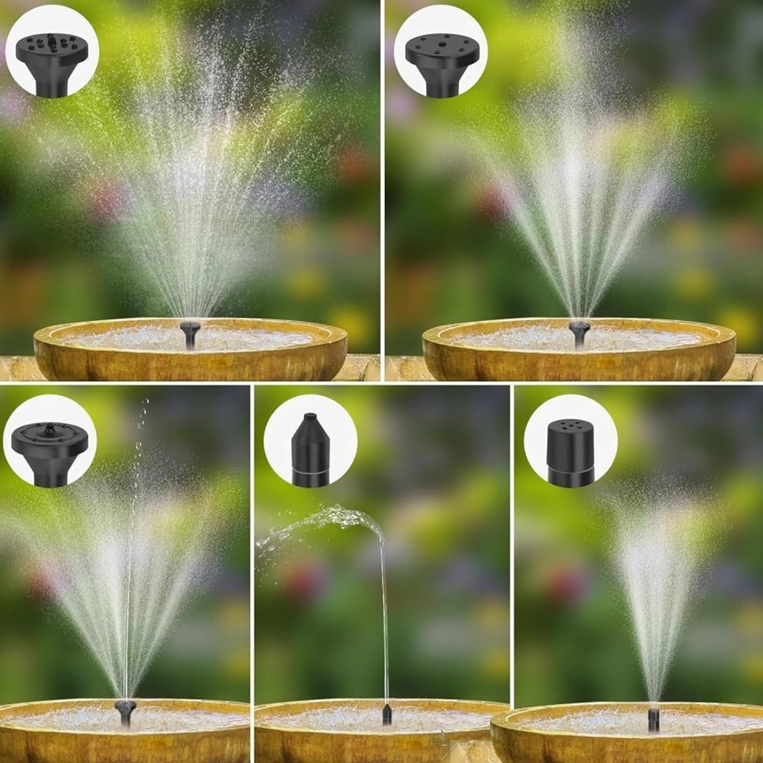 Цей комплект Сонячний водяний насос містить 4 різні форсунки, які можна легко замінити для отримання різних форм струменя. Його також можна прикріпити до шланга для створення різних водних елементів. Це універсальний сонячний водяний насос, який ідеально підходить для пташиних ванн, акваріумів, невеликих ставків і садів.