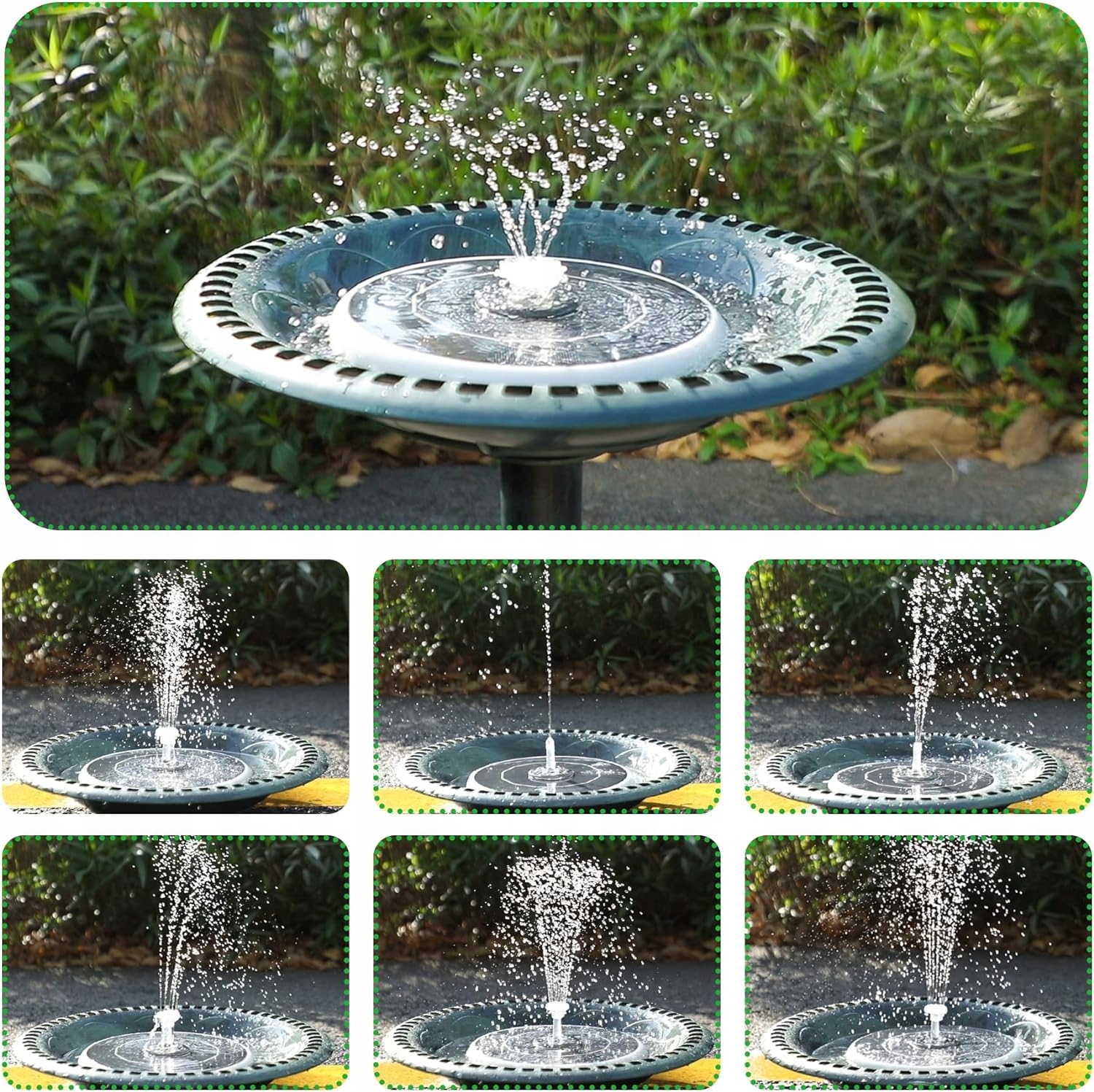 💧💧【6 типів форсунок】:Насос сонячного фонтану оснащений 6 форсунками з різними ефектами розпилення води. Різні форсунки можуть відповідати різним вимогам щодо висоти або форми бризок, а також запобігати розбризкуванню води з басейну.