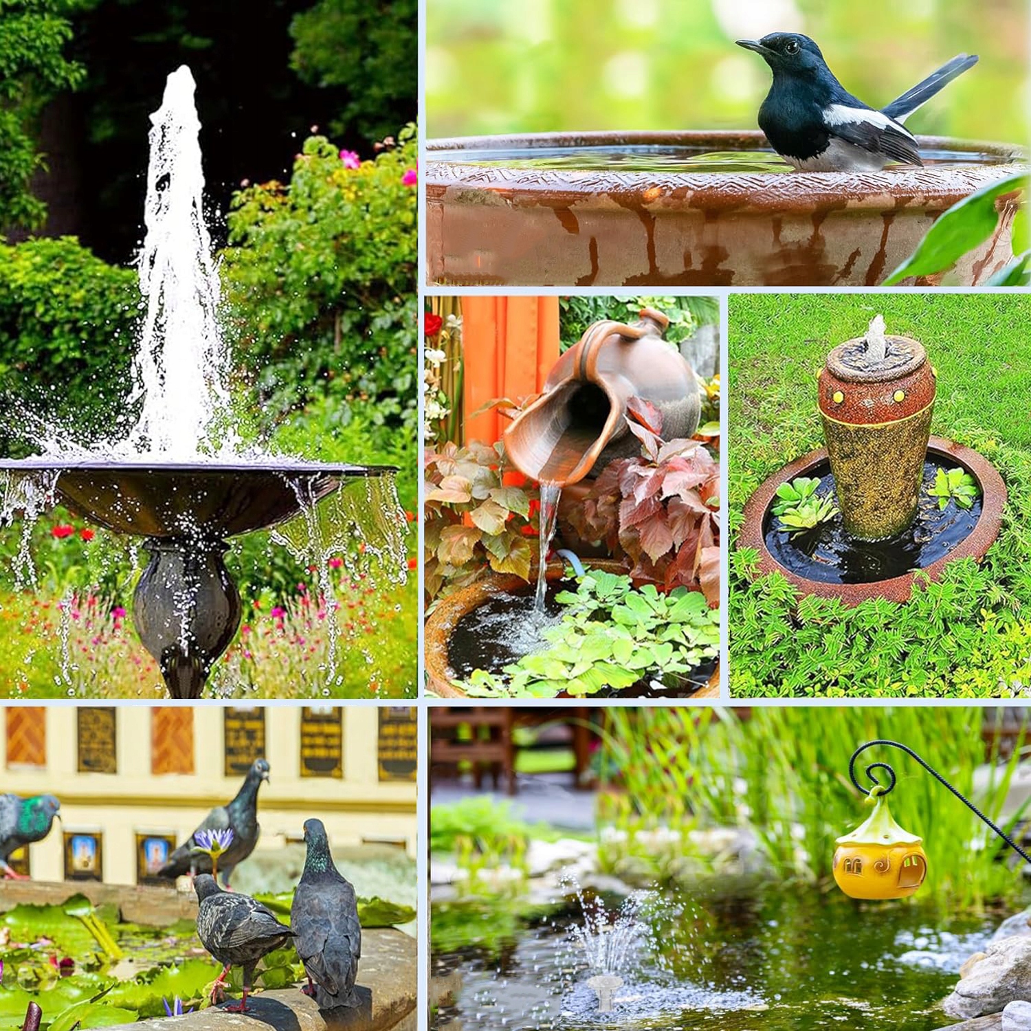 💧💧【Сонячний фонтанний насос】:Сонячний фонтан використовує високотехнологічні сонячні пластини, завдяки яким водяний насос працює навіть за слабкого сонячного світла, але ефект змінюватиметься залежно від кута й інтенсивності сонячного світла.