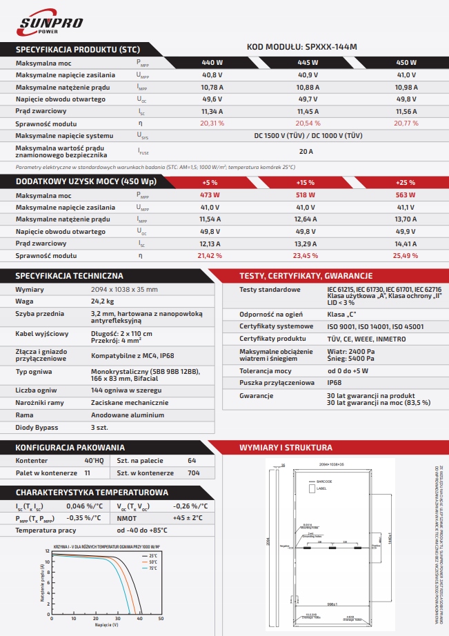 - Набір монокристалічних фотоелектричних панелей найвищої якості Sunpro Power SP450W-120M Half-cut Bi-Facial або новіше