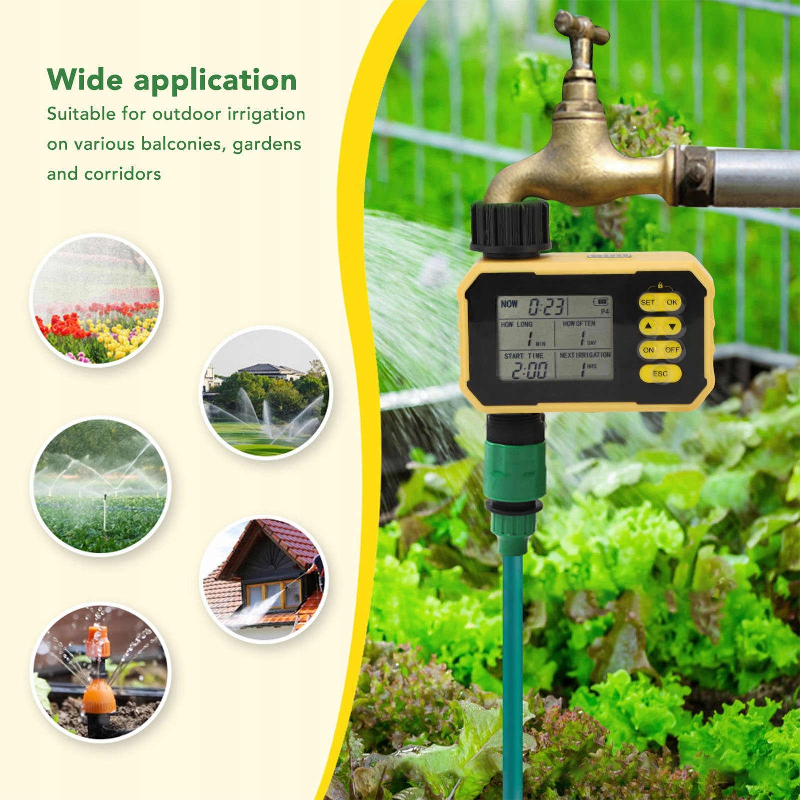 2. Інтелектуальний час: автоматичний підводний режим можна налаштувати гнучко, з кількома групами синхронізації та з точністю до іншої, що забезпечує легкий полив. Інтелектуальна функція таймера підтримує кілька налаштувань, може встановлювати кілька таймерів (P1-P4) відповідно на різні періоди для відкритого розпилення.