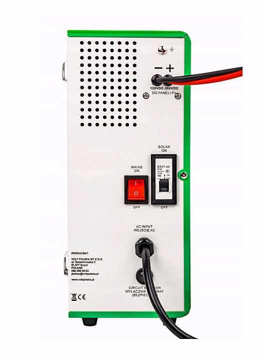 Конвертер Green Boost 3000 має дві розетки електромережі типу E. Позначено 1 і 2 відповідно. Після підключення напруги від фотоелектричної установки (120 В - 350 В) перетворювач перевірить наявність