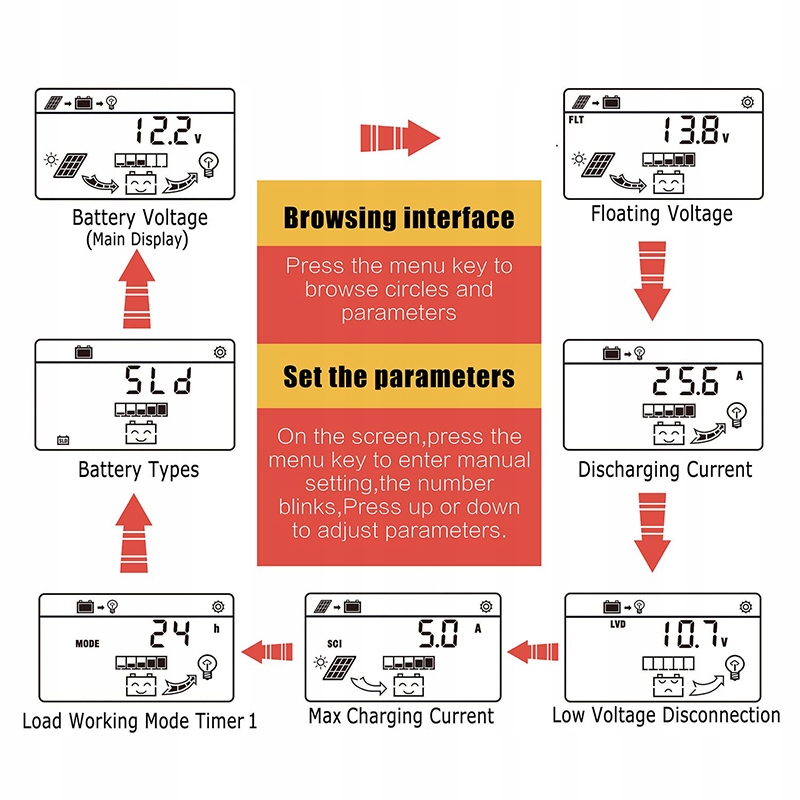 Можна адаптуватись до будь-якої програми користувача, свинцево-кислотних, AGM, GEL, LifePO4, літієвих та інших типів нестандартних батарей. Щоб подовжити термін служби батареї, коли напруга батареї виходить за межі діапазону, сонячний контролер автоматично вимикається.
