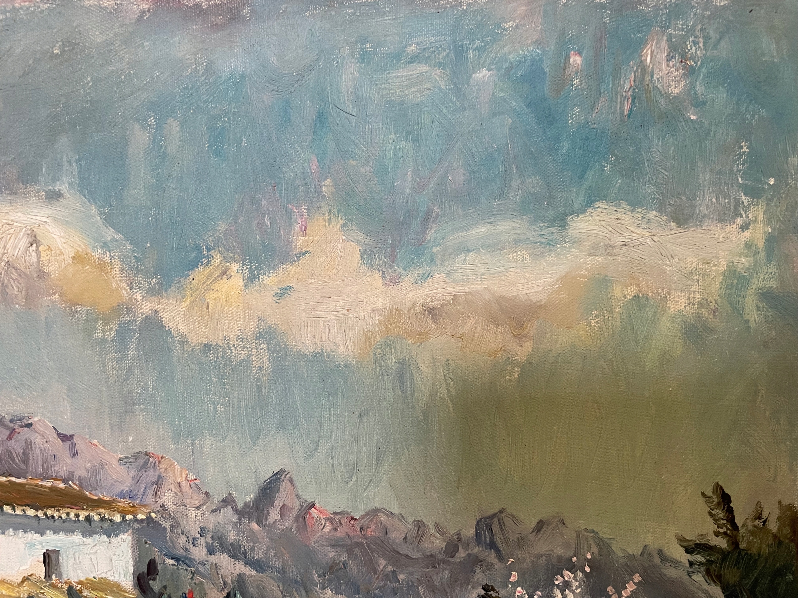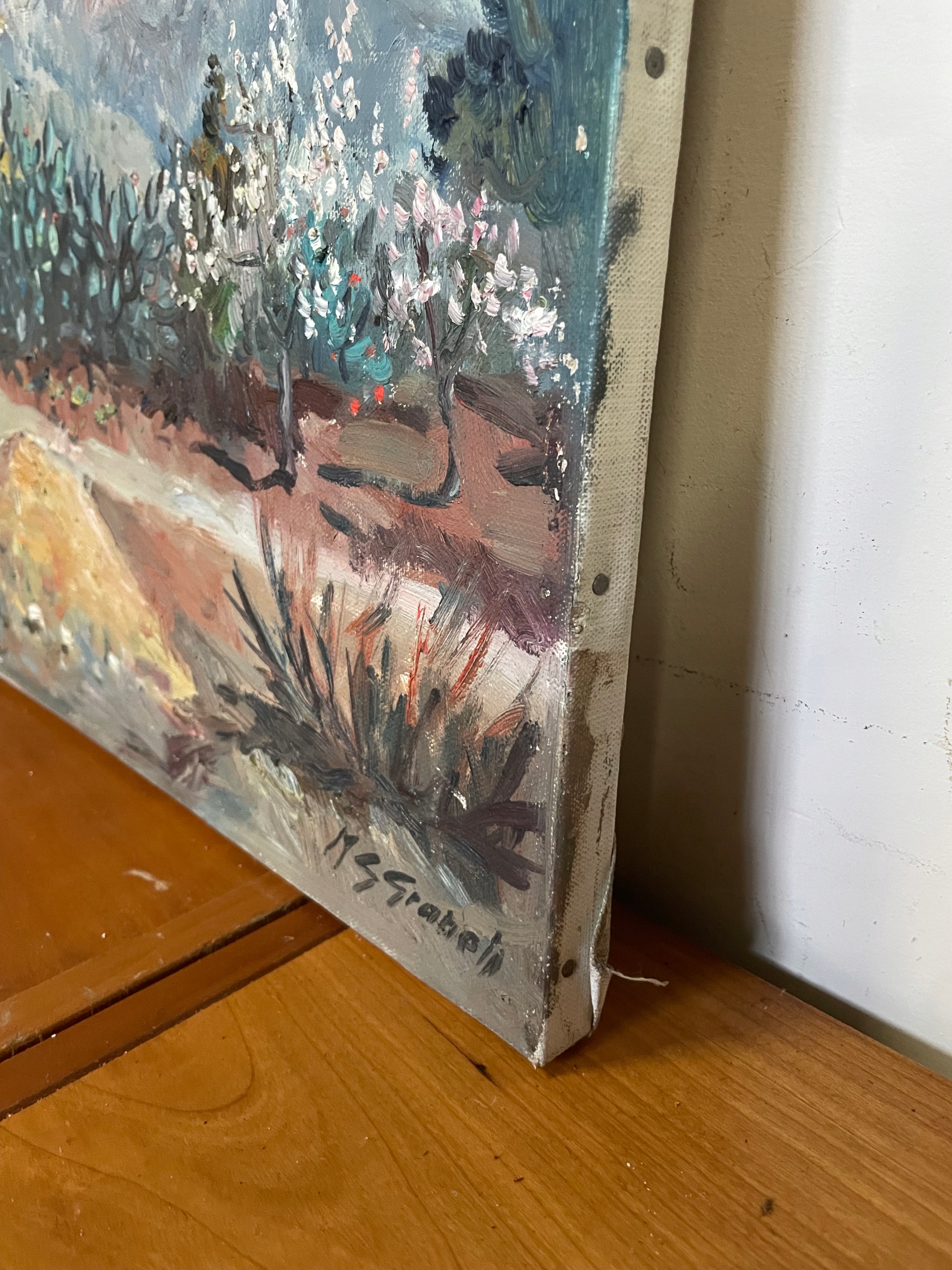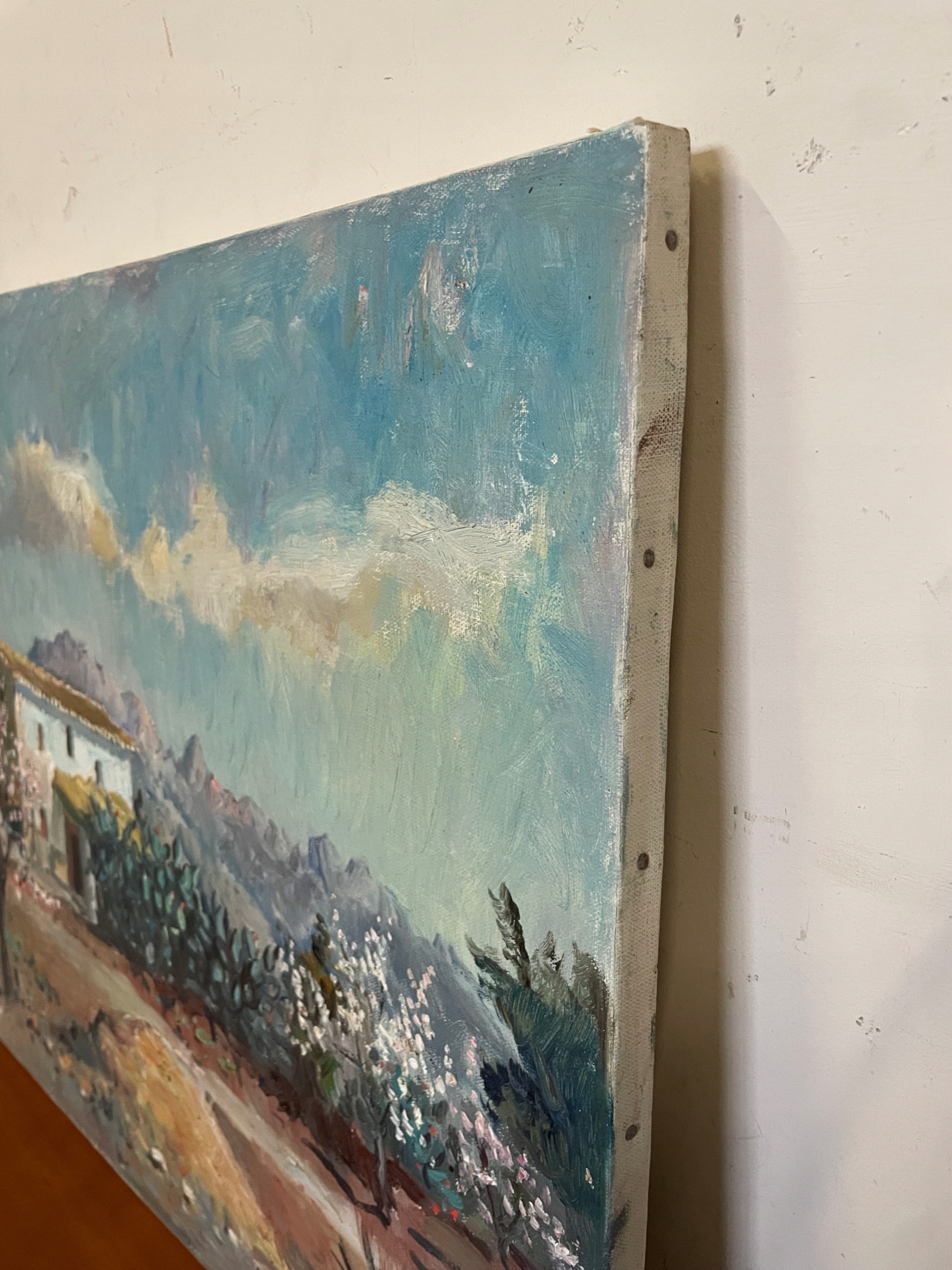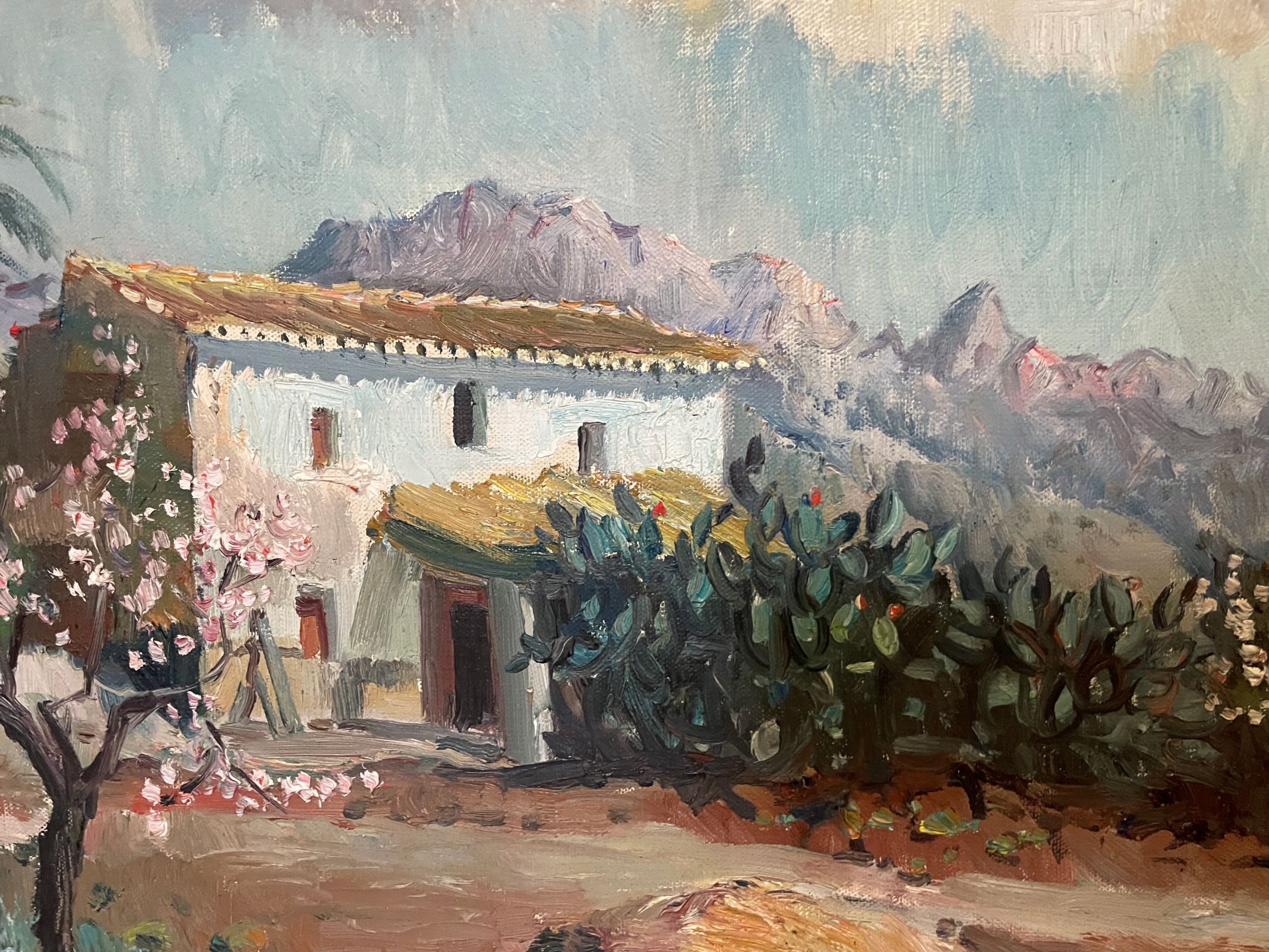 Запрошую придбати атмосферну картину маслом із зображенням мальовничого південного пейзажу. Для роботи характерні прекрасні світлі та спокійні кольори, які створюють атмосферу святкового спокою.