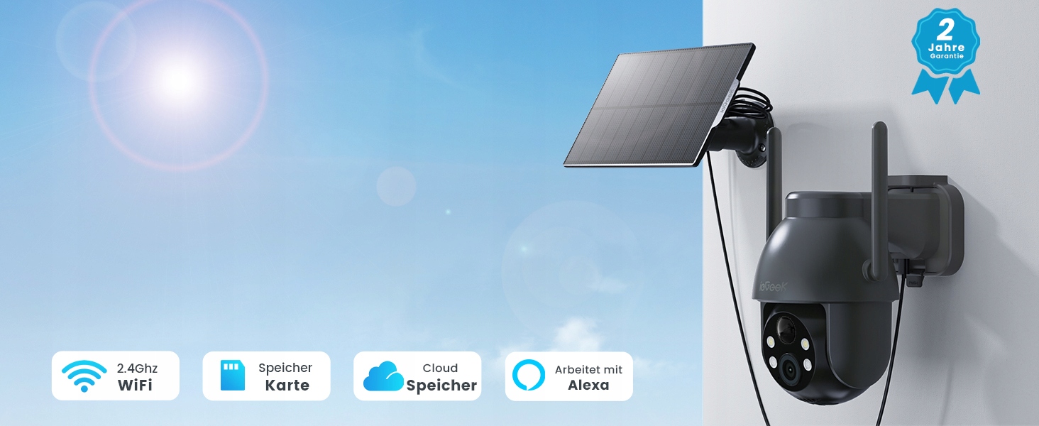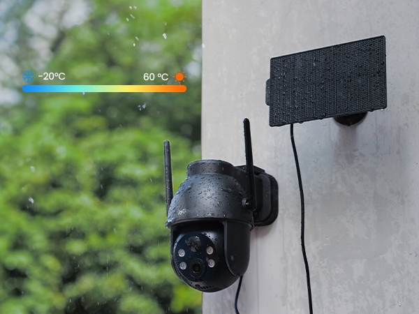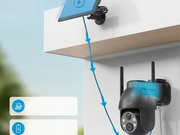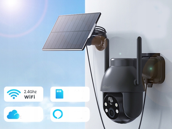 100% бездротової камери моніторингу IEgeek з вбудованою акумулятором та сонячною панеллю, що забезпечує постійне джерело живлення. Простий у встановленні, його можна встановити на стіні.