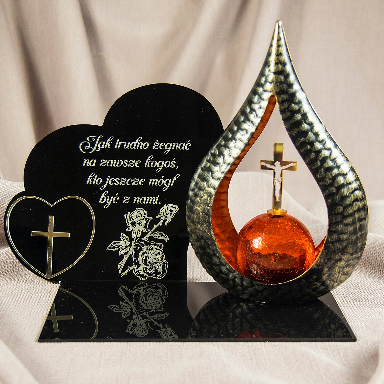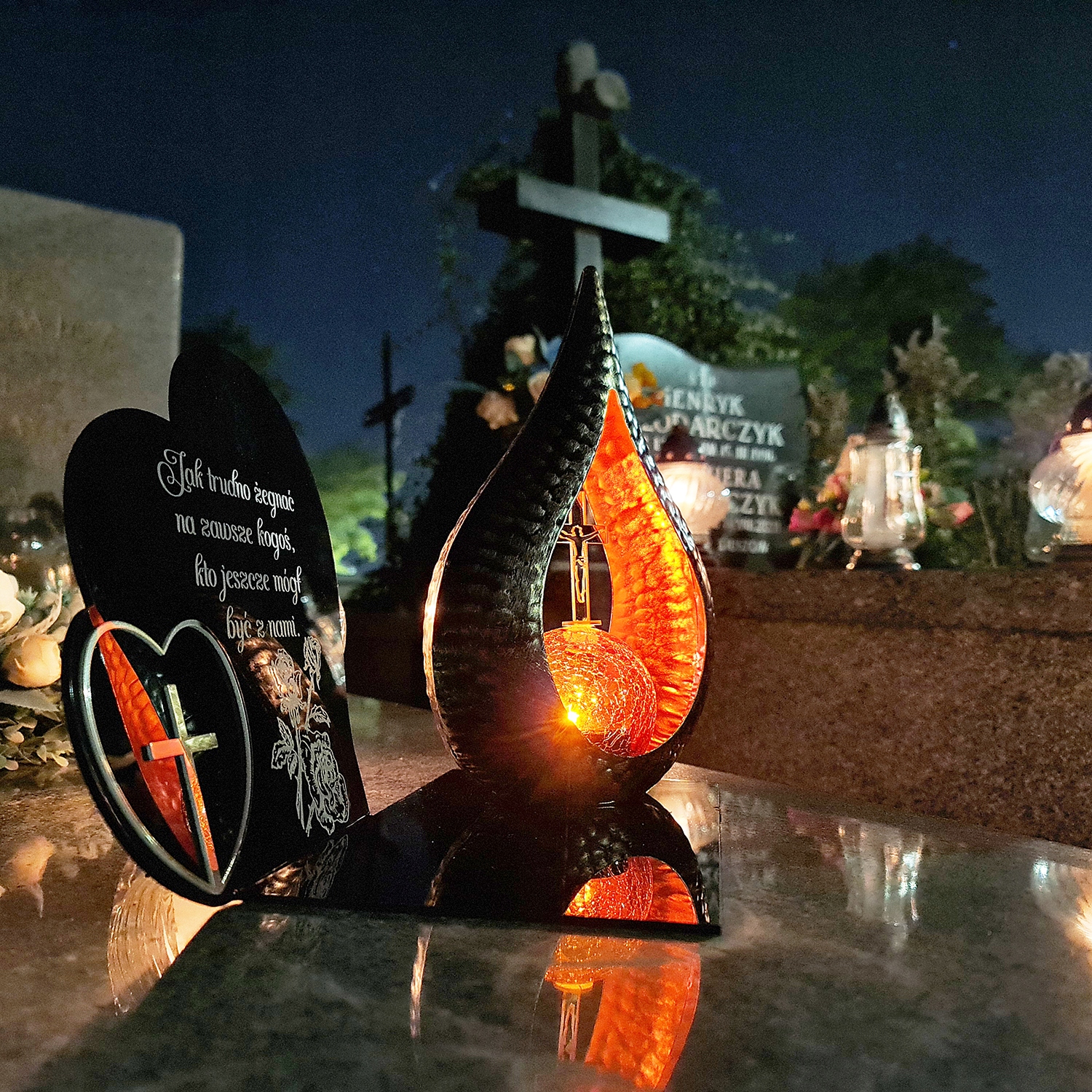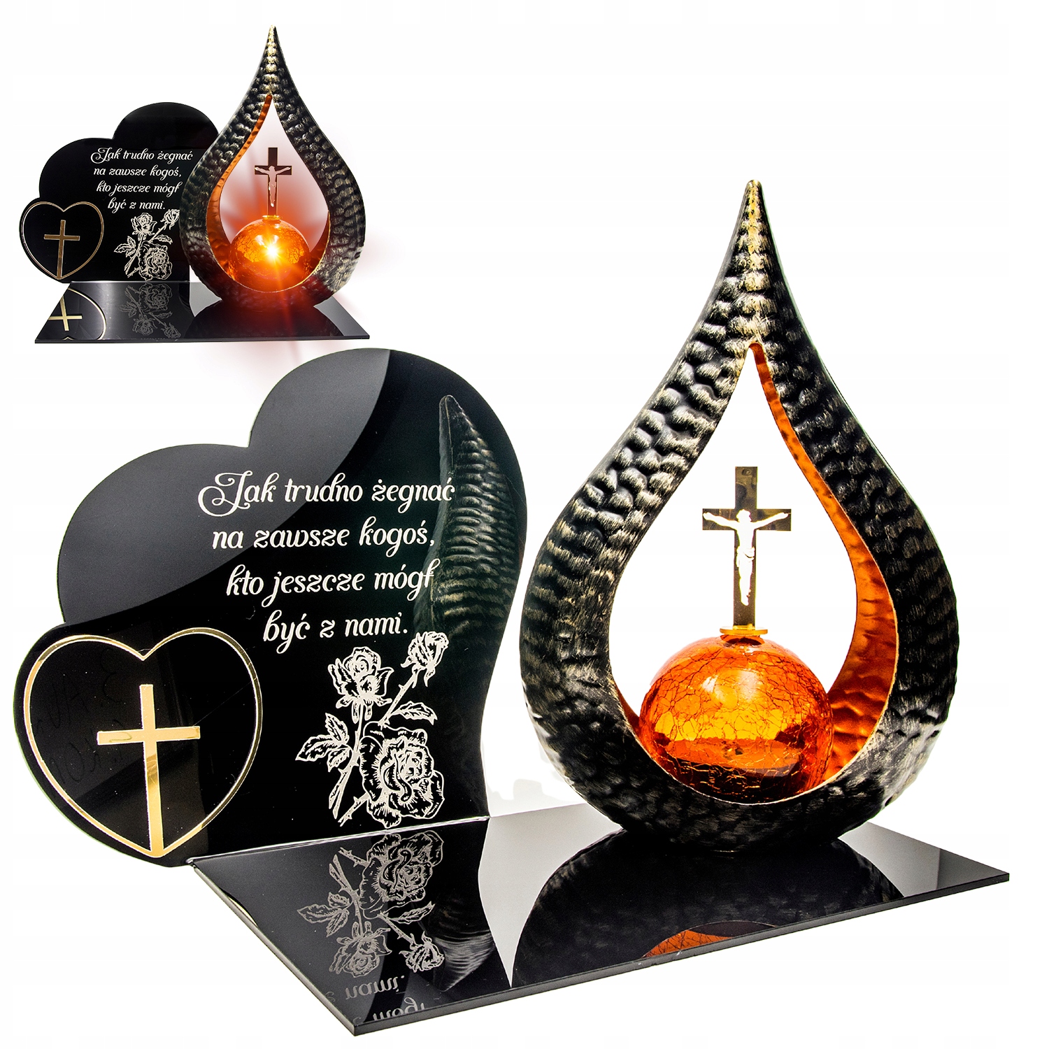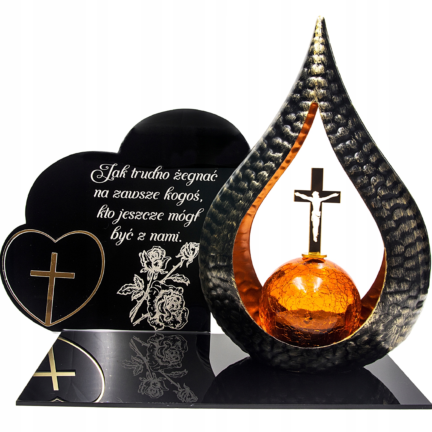 елегантна світлодіодна сонячна свічка для могили з гравірованою акриловою скляною підставкою, прикрашеними золотим серцем.