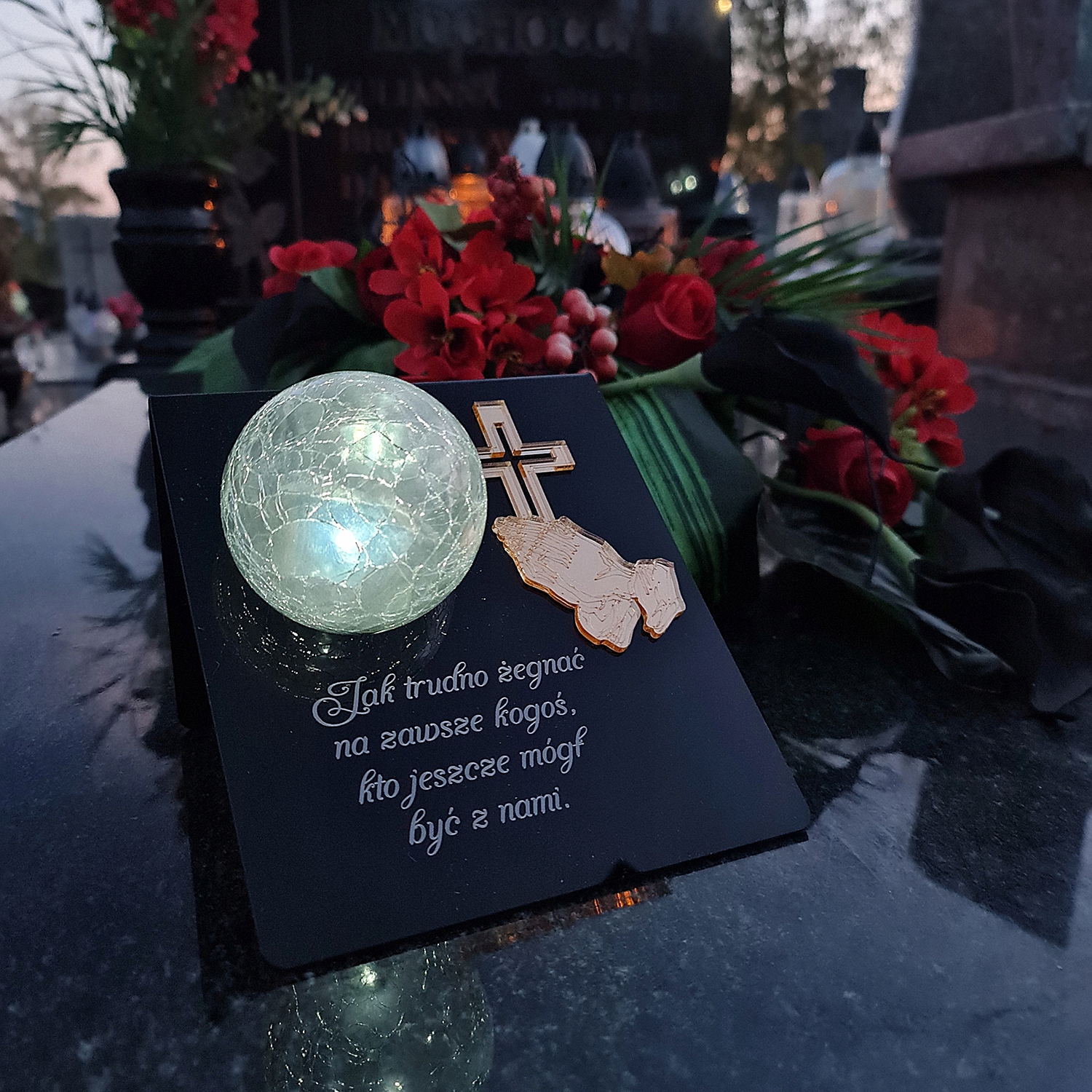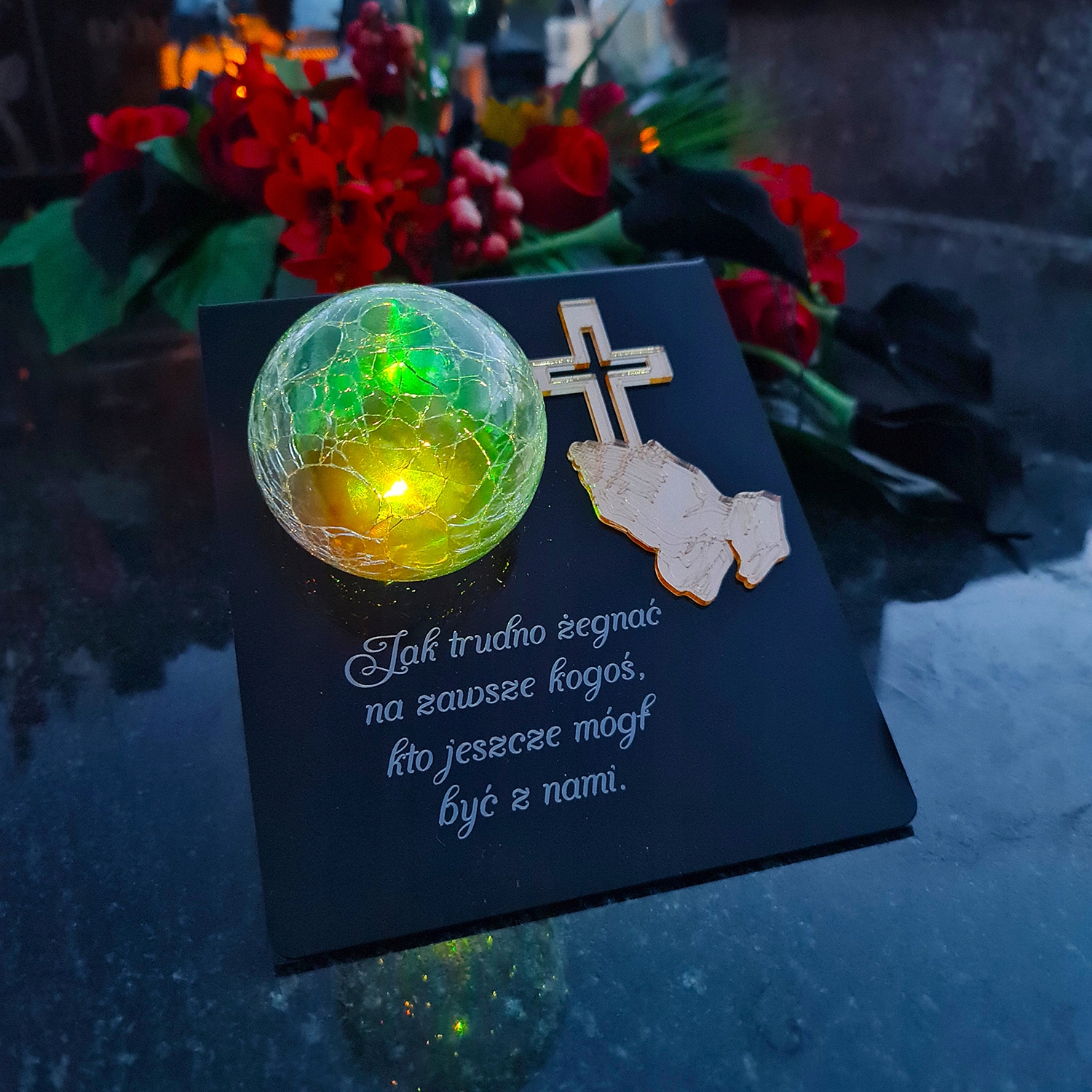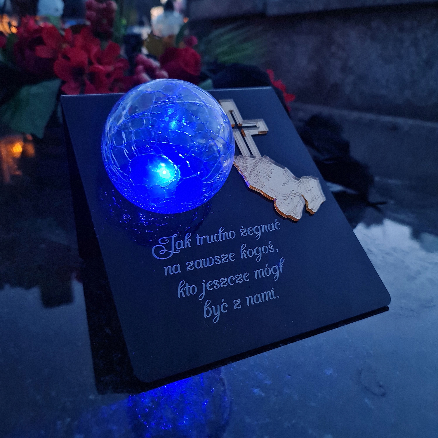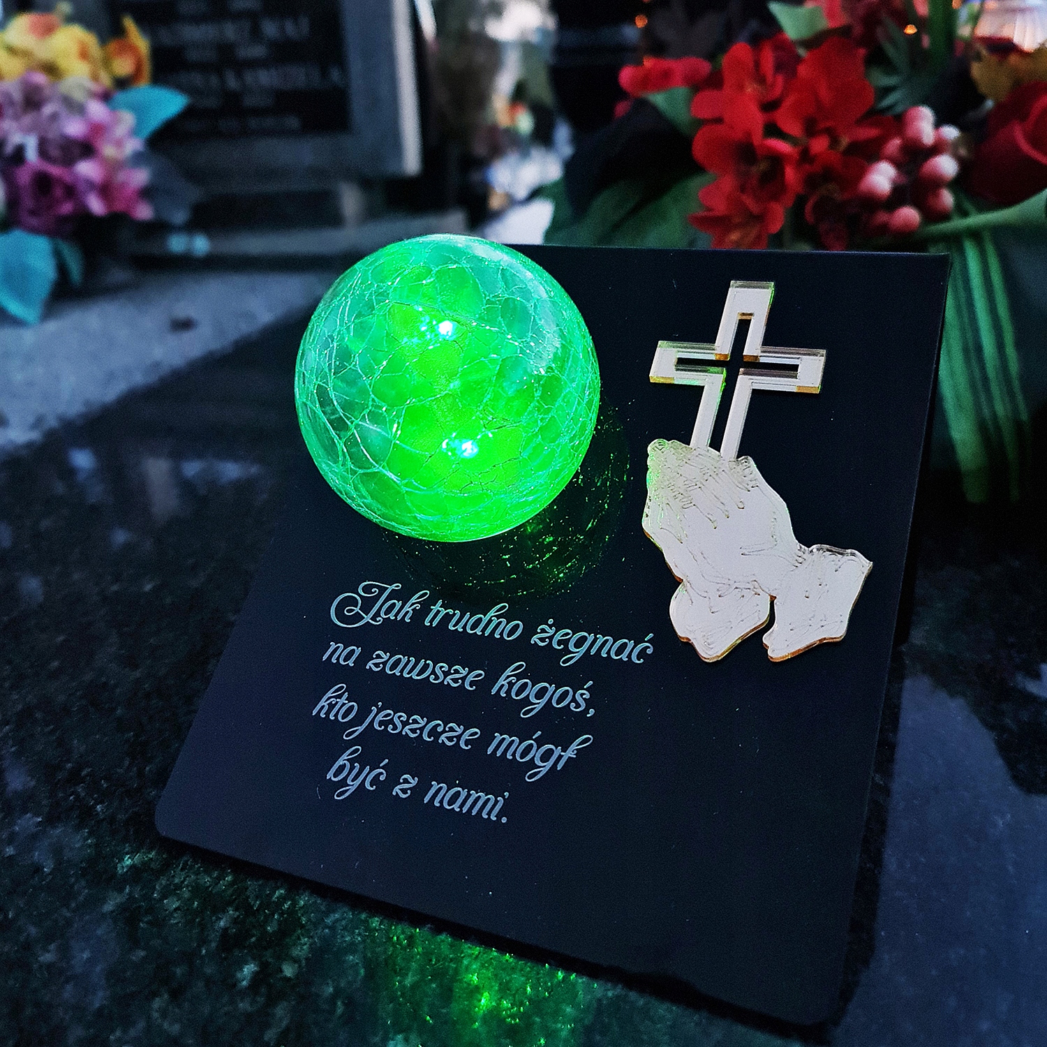 елегантна світлодіодна сонячна свічка для могили, яка світить у двох режимах: білий і барвистий RGB, з гравірованою акриловою скляною підставкою, прикрашеною золотим мотивом.