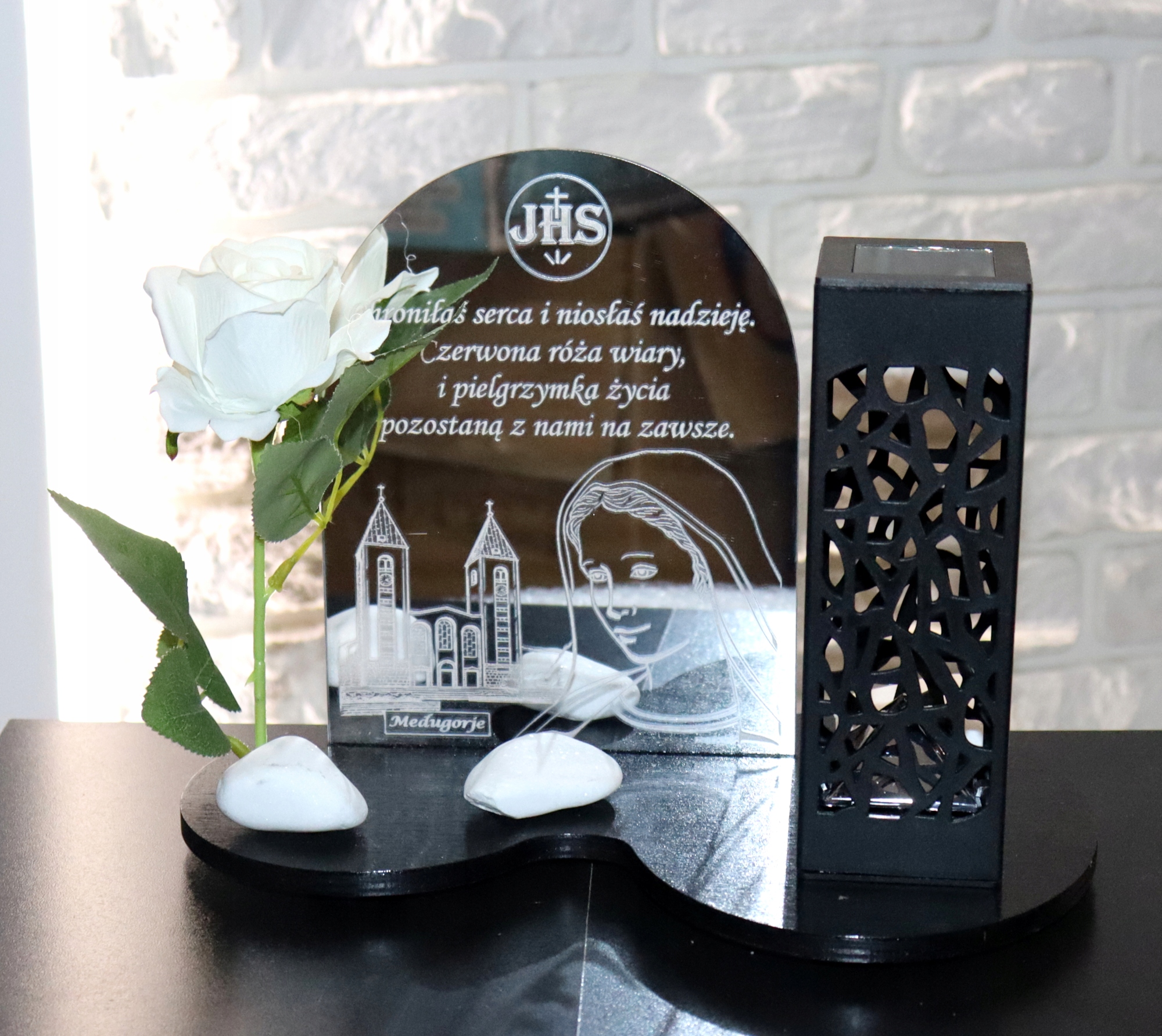 Сонячна свічка для могили з елегантною підставкою, яка ідеально поєднує функціональність з естетикою. Свічка оснащена сонячною панеллю та делікатним невеликим світлом, завдяки якому після темряви вона випромінює делікатне світло, створюючи атмосферу відбиття та пам'яті. Бзозова, пофарбована в колір темної деревини. На підставці також встановлюється біла велюрна троянда, що завдяки її реалізму дає унікальність. Це ідеальний вибір для могили для коханої людини, яка, завдяки сонячному живлення, -це технічне обслуговування та екологічне, і в той же час -це прекрасний духовний сувенір. Роза. Освітлення після темряви.