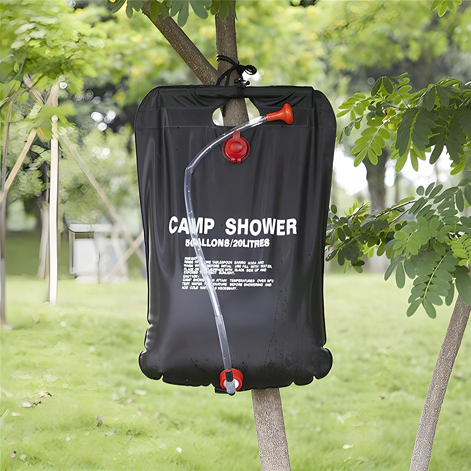Часто під час табору в місцях, віддалених від води, нам не вистачає води, щоб приготувати їжу чи скупатися. Сумка для душу на сонячних батареях – ідеальне рішення. Просто налийте в мішок до 20 літрів води, а потім повісьте його на сонячному місці. Чорний колір сумки дозволяє сумці нагріватися набагато швидше. Він нагріє воду до 50°C.
