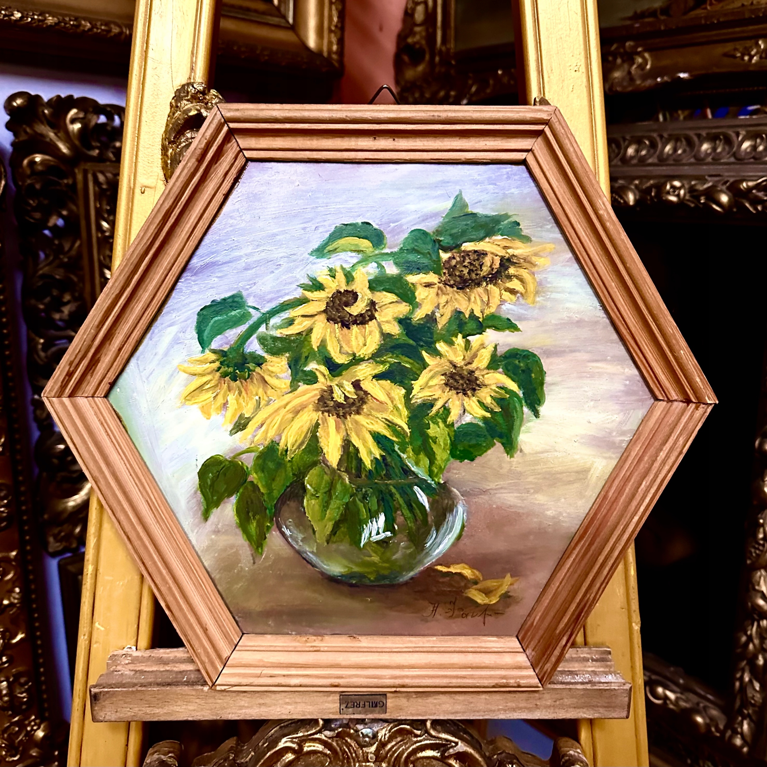 СОНЯШНИКИ, ГАРНА ГРУБО НАМАЛЕНА СТАРА КАРТИНА В ШЕСТИКУТНІЙ РАМІ