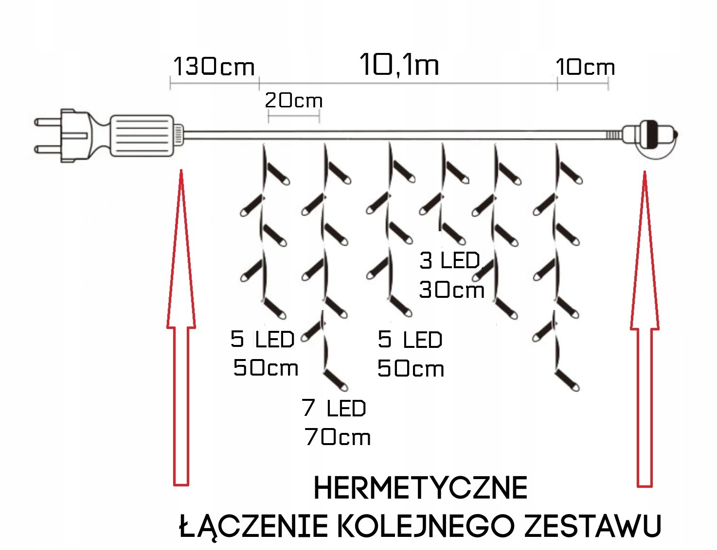 10,1 м довжини світла + 1,3 м кабелю живлення + 0,1 м підключення для наступних наборів (оригінальна довжина виміряна вручну!!!)