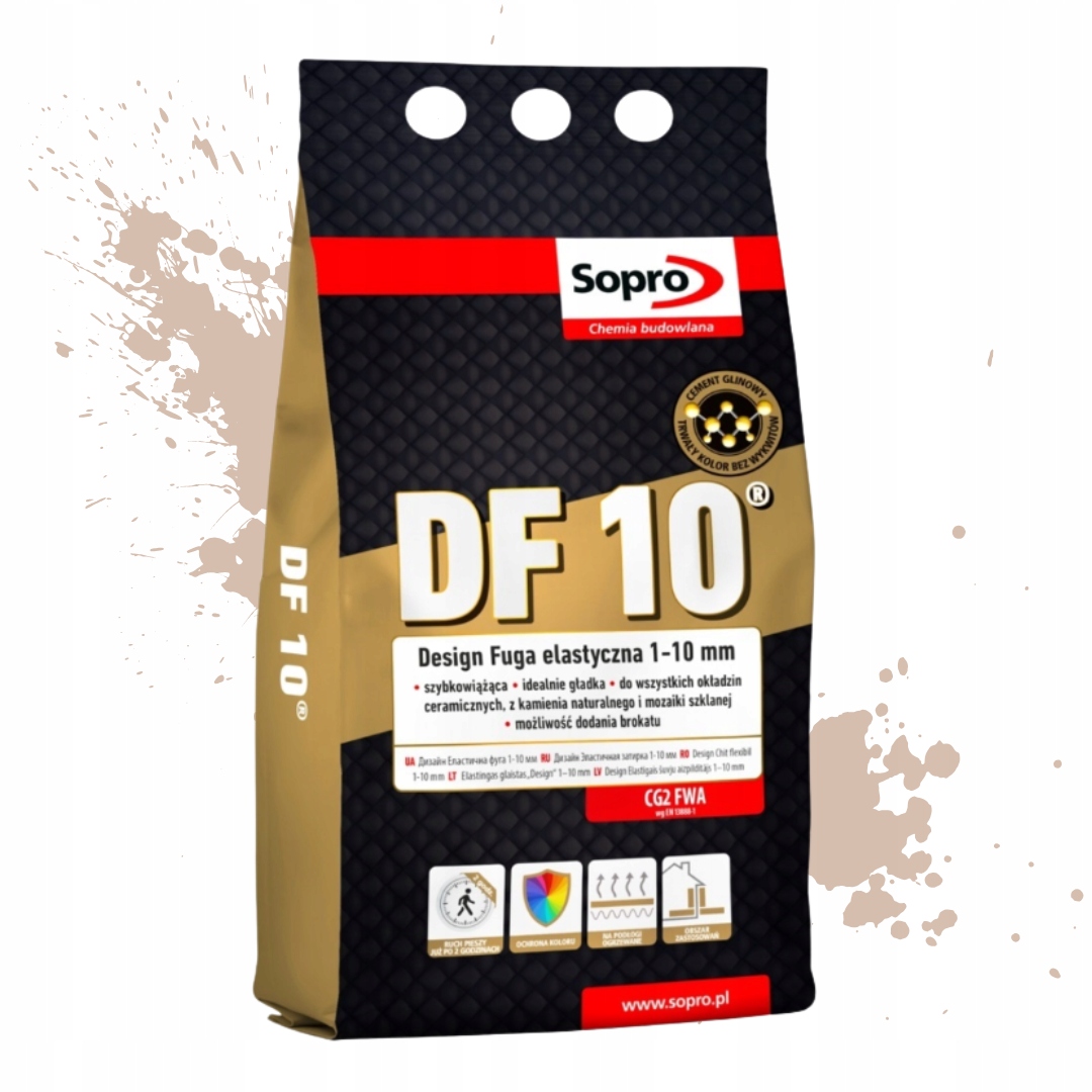 - для з'єднання всієї керамічної обшивки, бетонних пластин та натурального каменю, тонких плиток та плит, а також скляних мозаїки та конгломератних панелей, з швачкою в діапазоні 1-10 мм, внутрішніх та на вулиці, на стінах та підлотах. SOPRO DF 10 може бути вдосконалений додаванням золотого, срібного або мідного SoPro блиску.