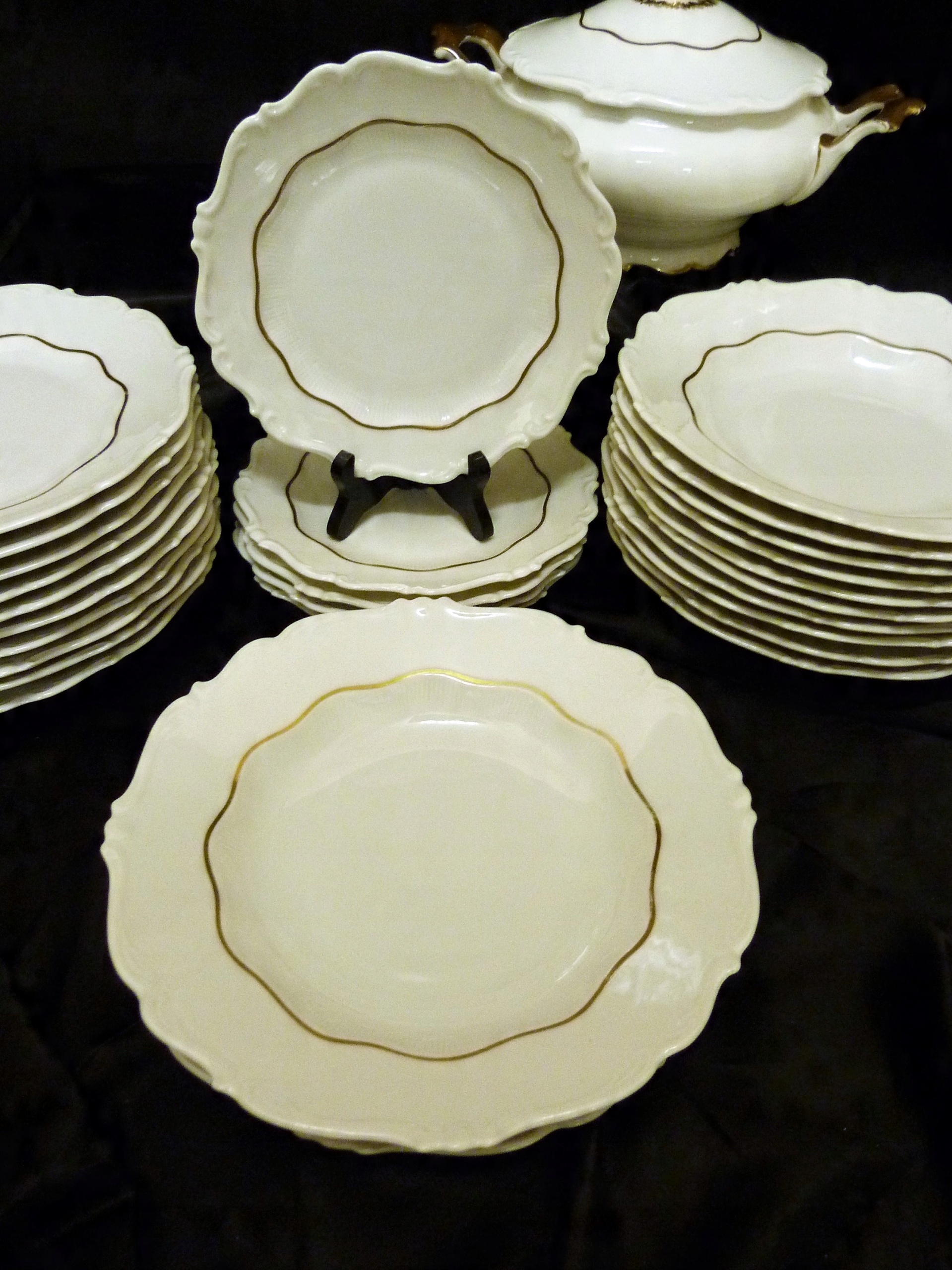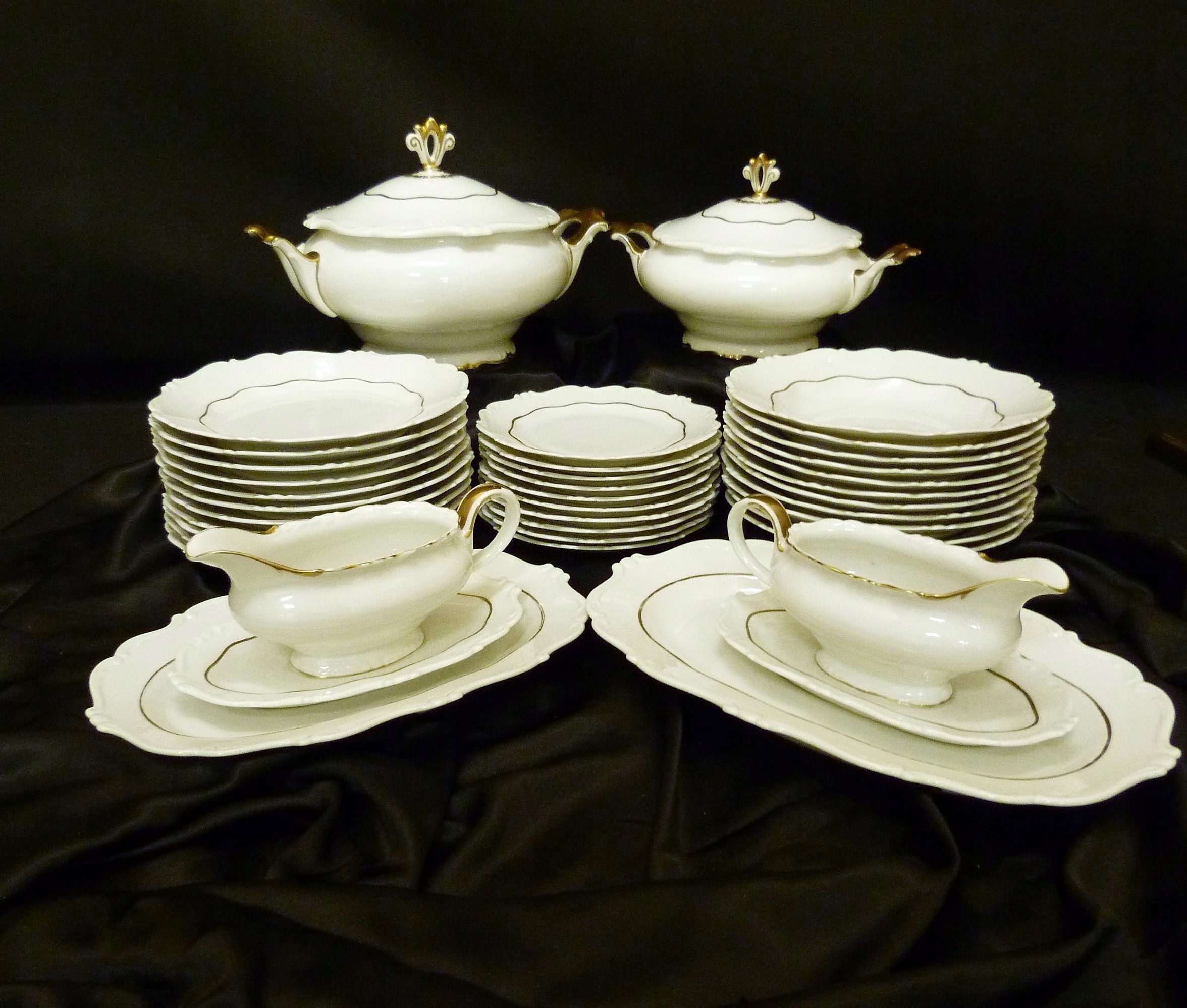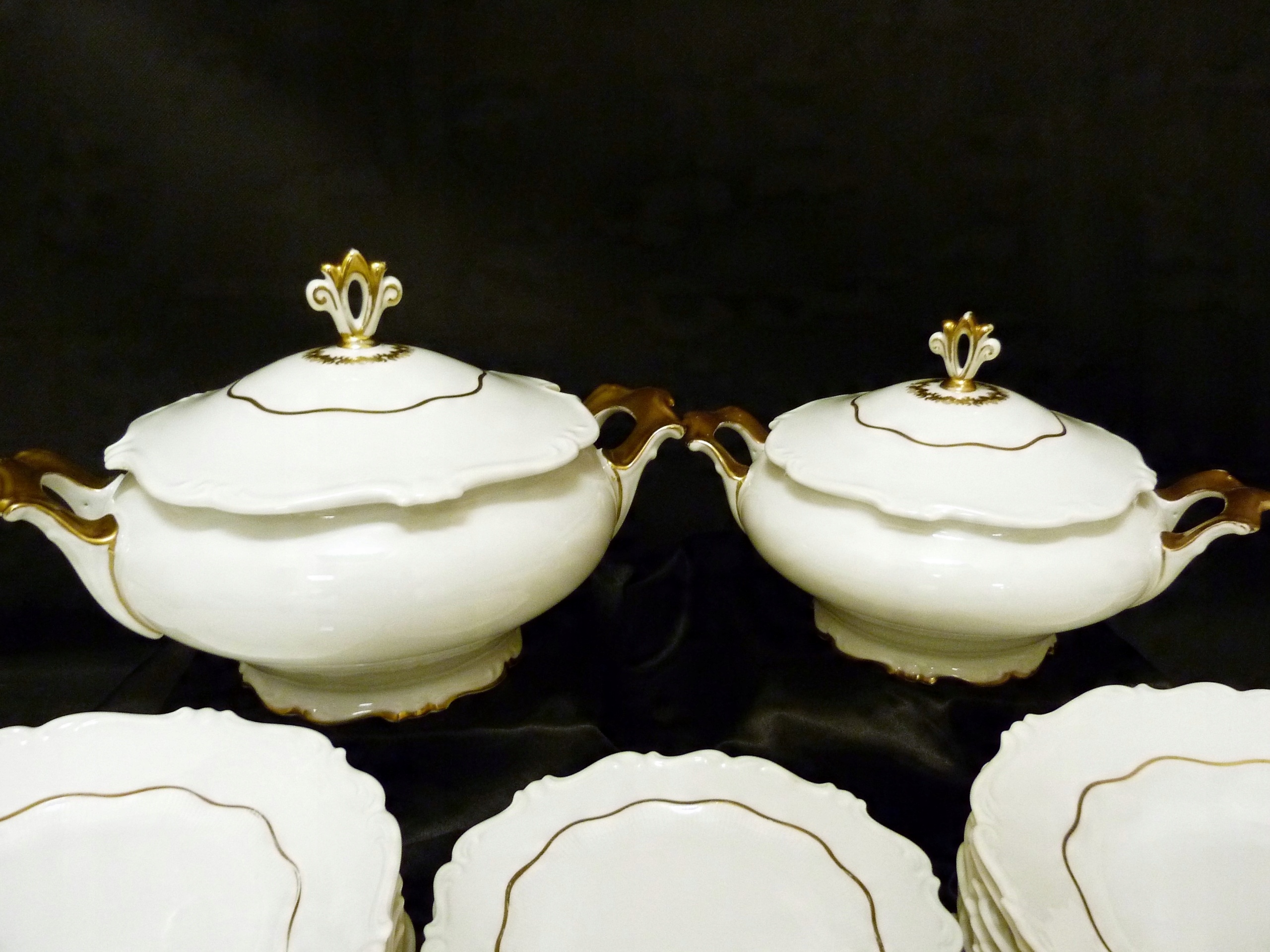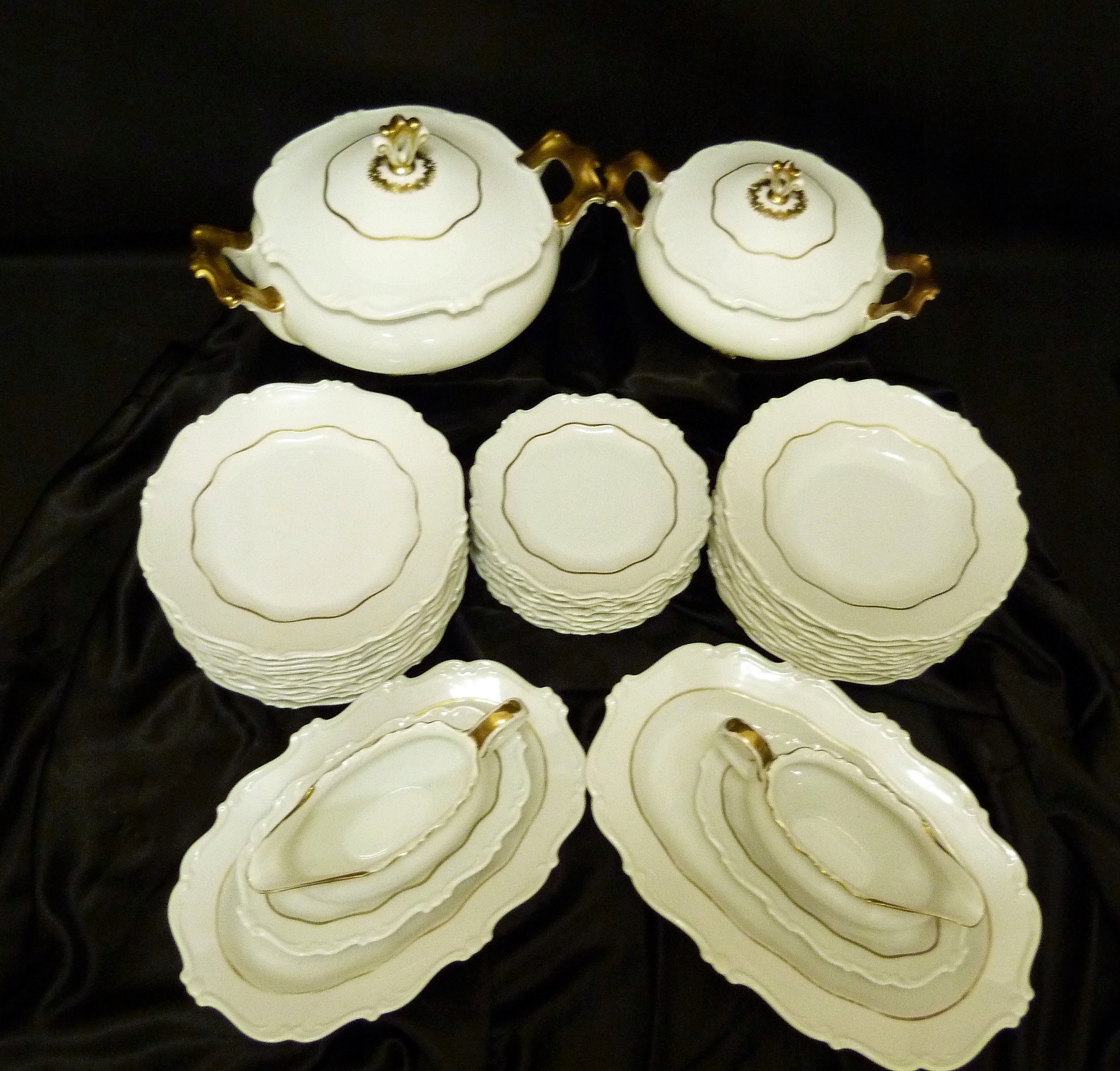 Ми рекомендуємо вартий уваги обідній сервіз на 11 персон (усього 12 тарілок) приблизно 1933 року виробництва Sorau Żary, модель Kavalier, виготовлений з порцеляни, рівної якості Rosenthal, білий, але не білосніжний, прикрашений рифлений візерунок, рельєф, позолота Кришки вази увінчані витонченою ручкою, ручки рясно позолочені Сервіз складається з 39 частин Кришка великої вази має втрату порцеляни на внутрішньому фланці золото на трьох елементах досить потерте,що видно на додаткових фото.В решті сервіс нормальний.Сліди користування.