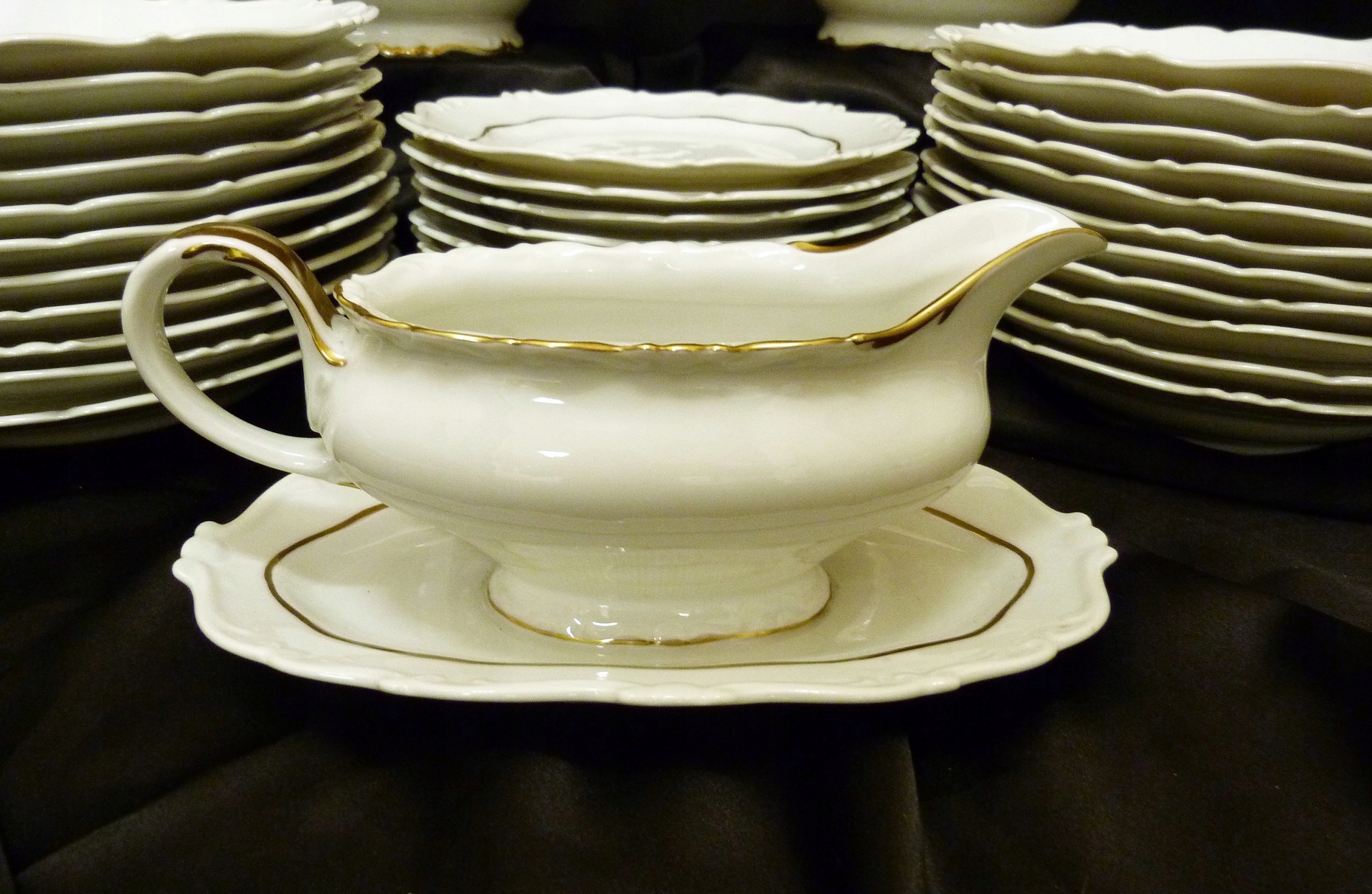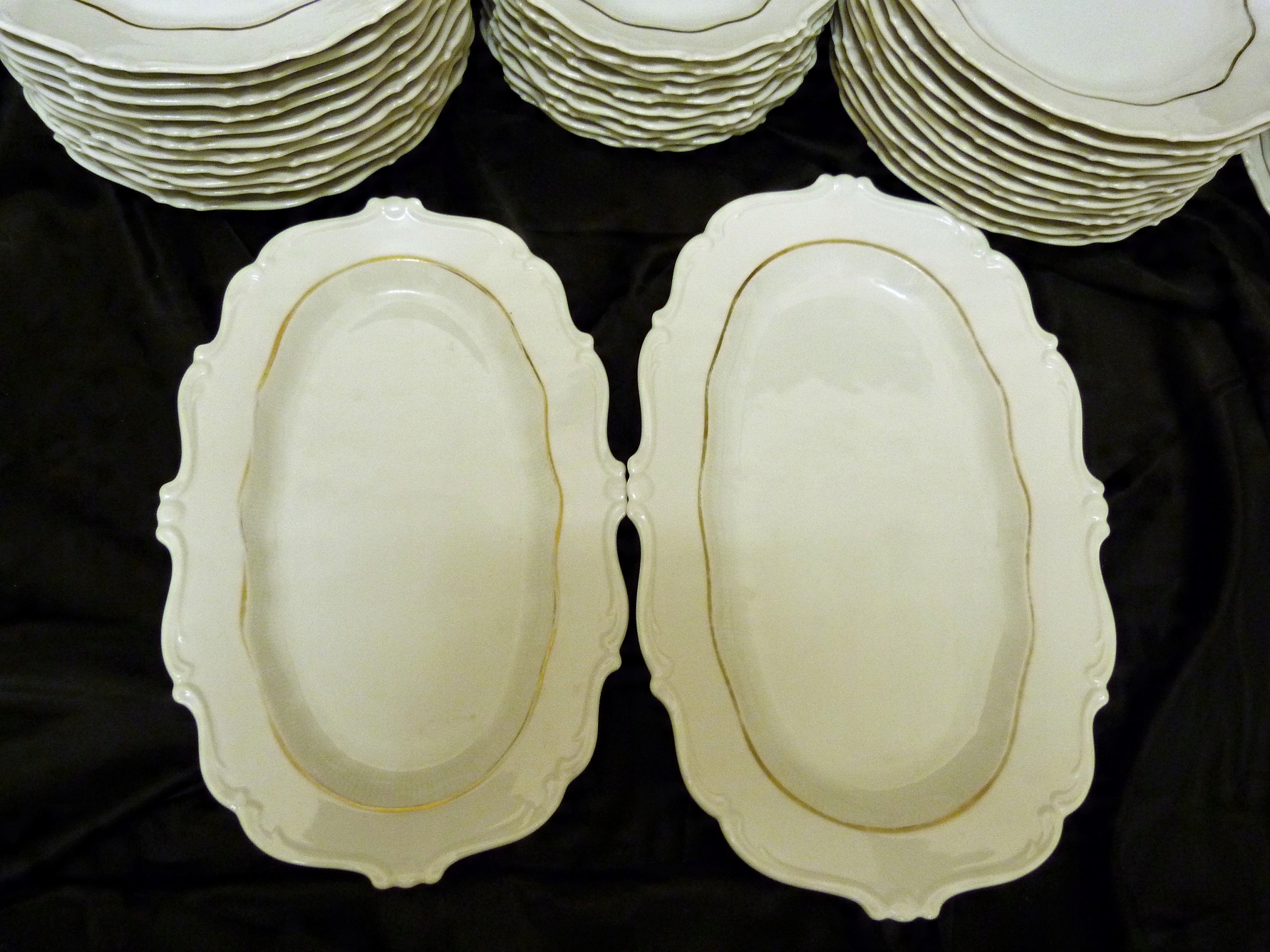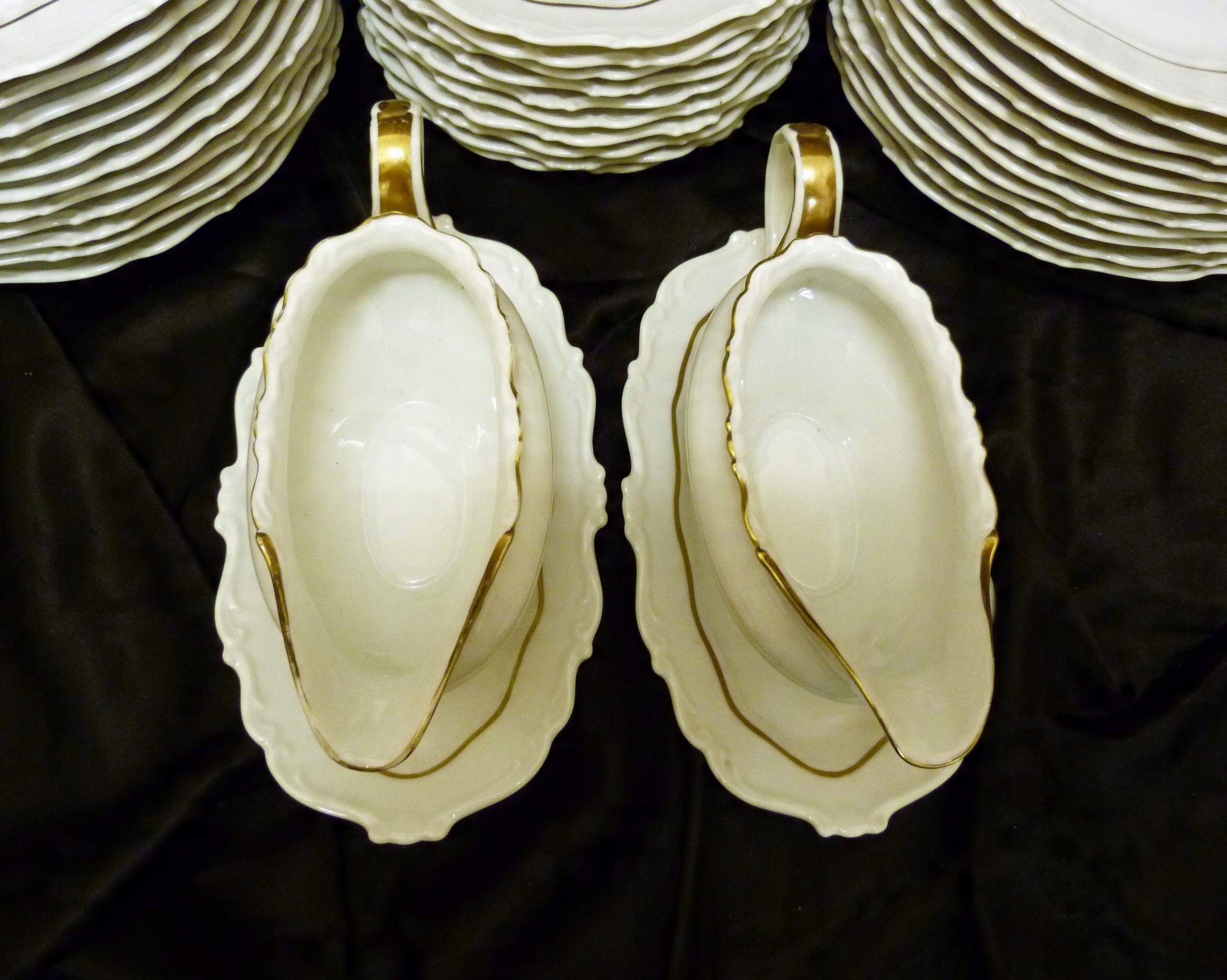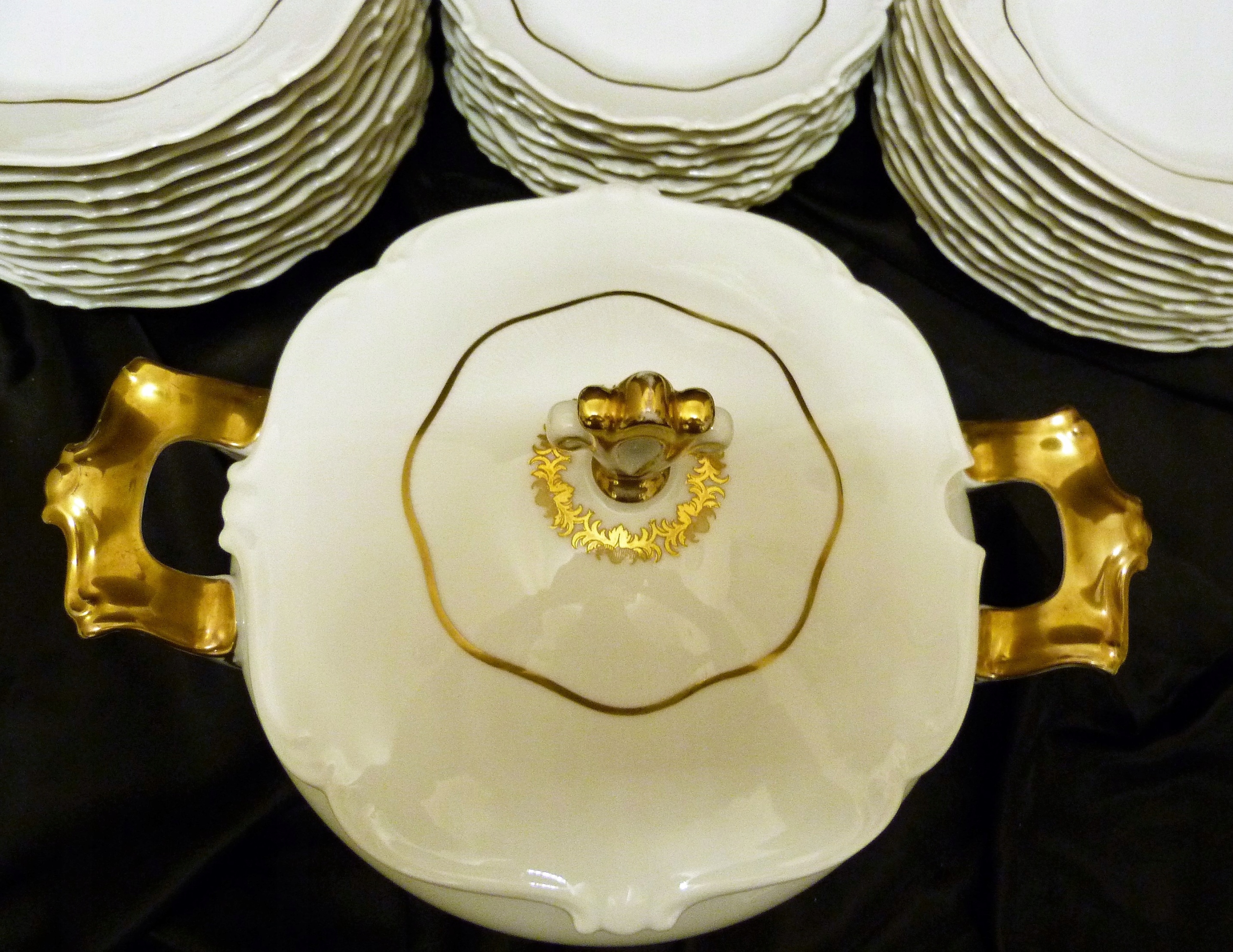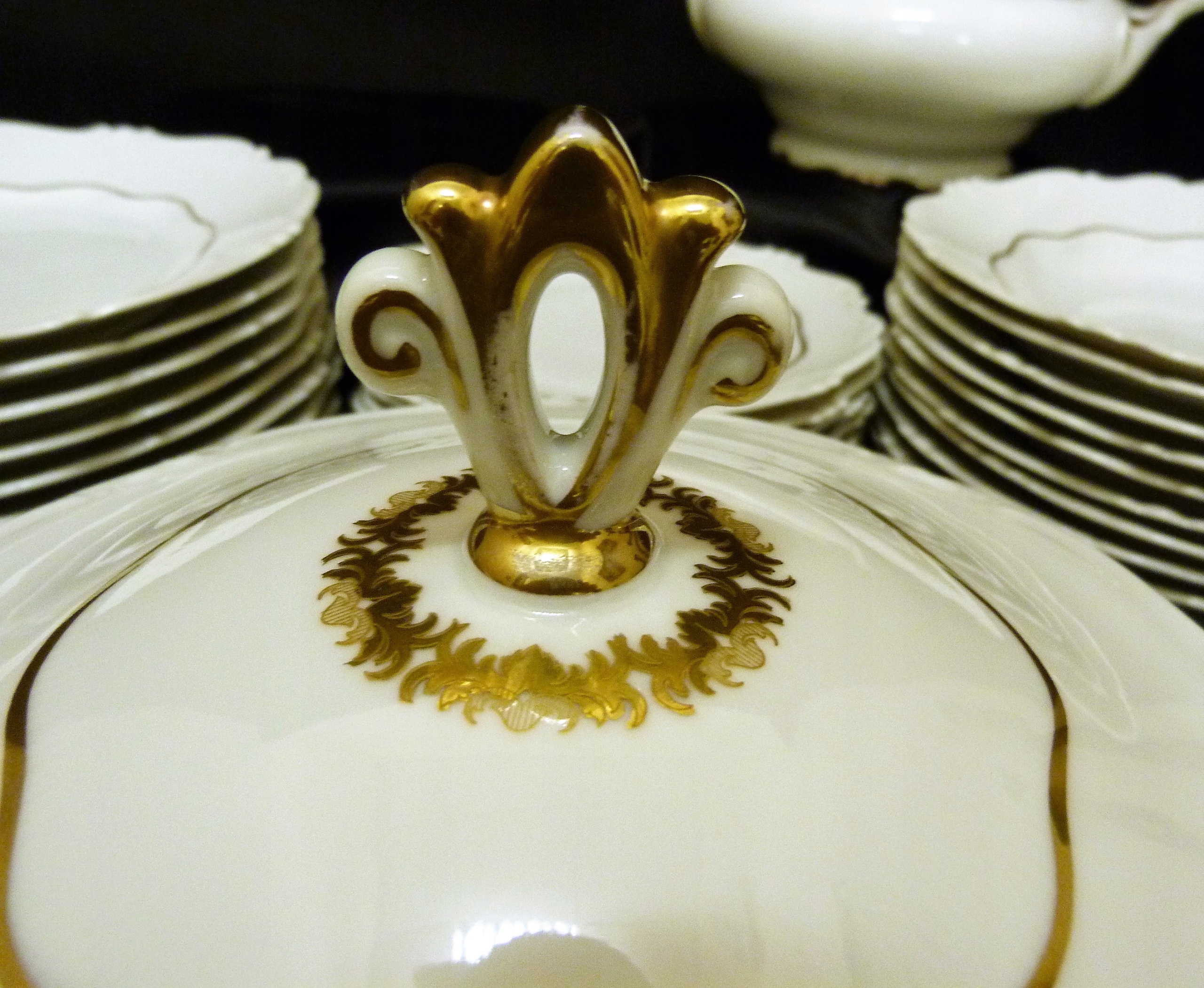 Ми рекомендуємо вартий уваги обідній сервіз на 11 персон (усього 12 тарілок) приблизно 1933 року виробництва Sorau Żary, модель Kavalier, виготовлений з порцеляни, рівної якості Rosenthal, білий, але не білосніжний, прикрашений рифлений візерунок, рельєф, позолота Кришки вази увінчані витонченою ручкою, ручки рясно позолочені Сервіз складається з 39 частин Кришка великої вази має втрату порцеляни на внутрішньому фланці золото на трьох елементах досить потерте,що видно на додаткових фото.В решті сервіс нормальний.Сліди користування.