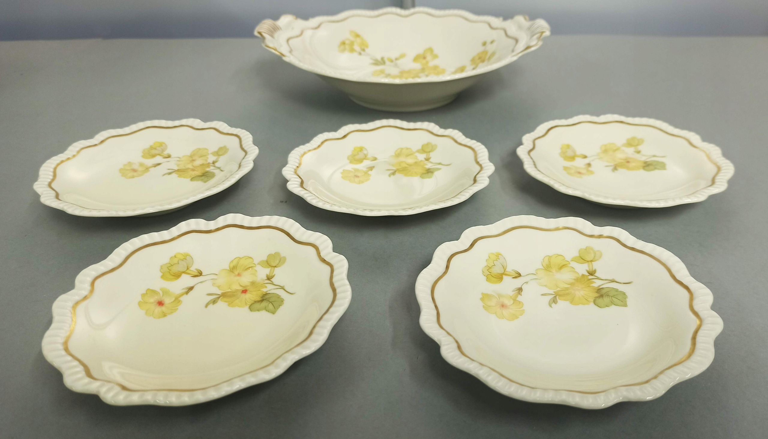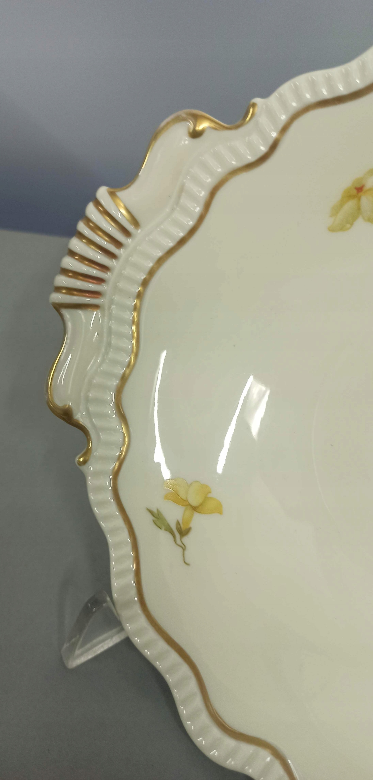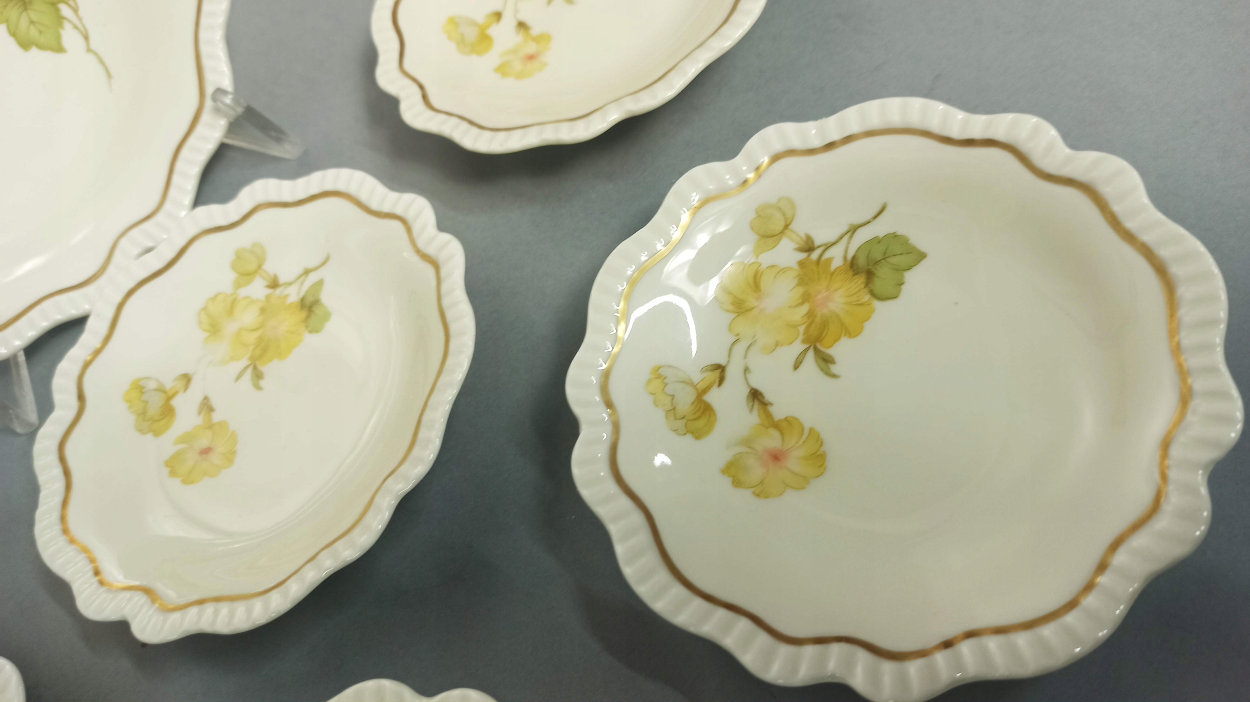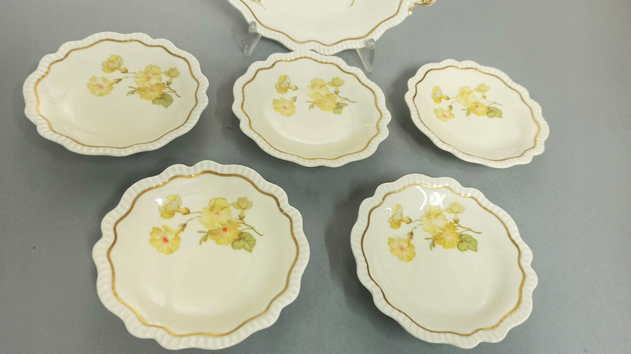 Благородну порцеляну кольору слонової кістки прикрашали жовті квіти. Ручки та окантовка тарілки й тарілок покриті золотом.