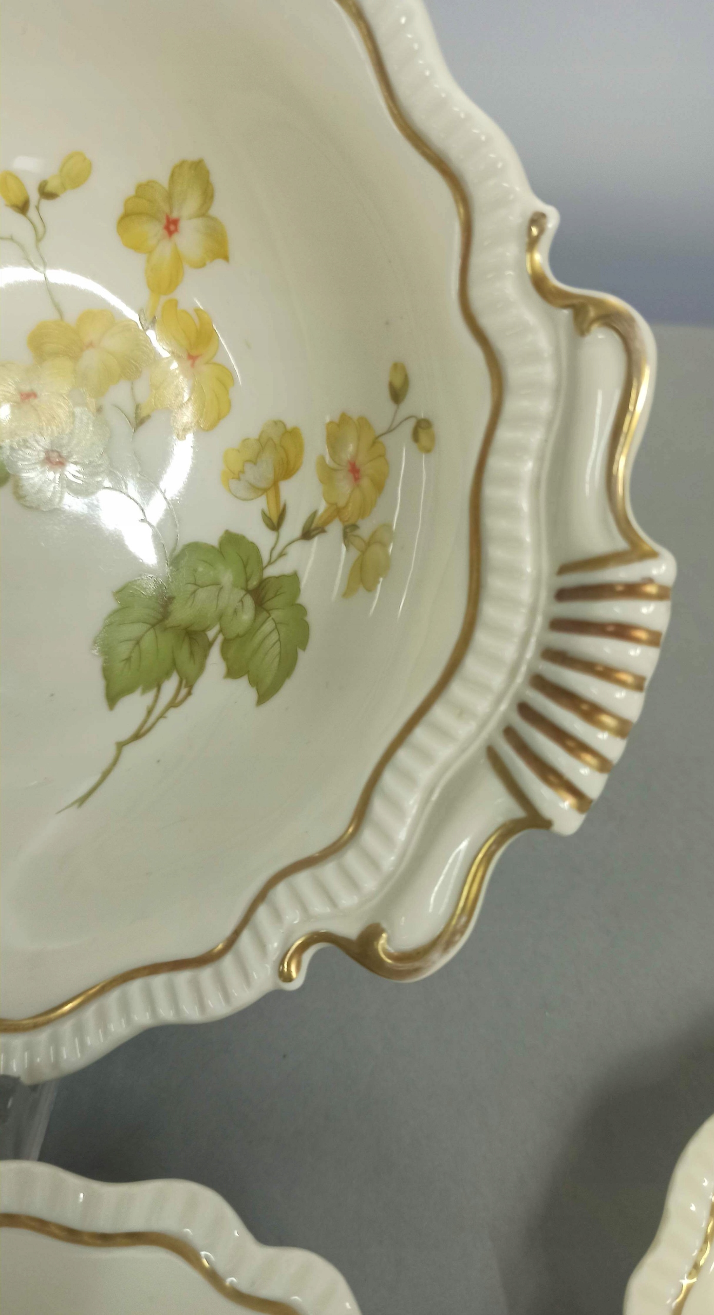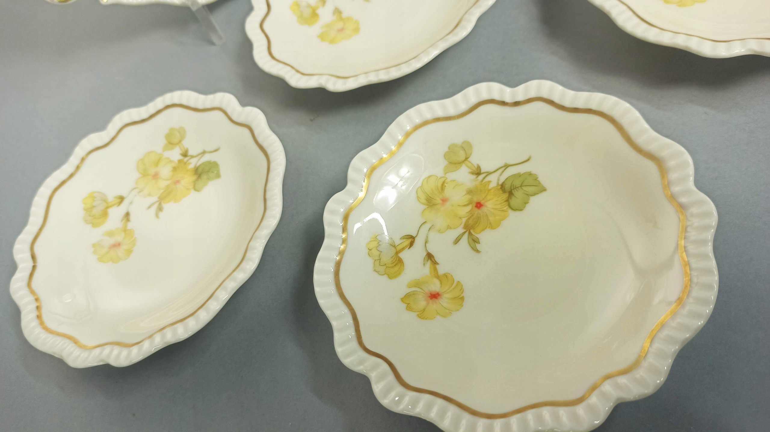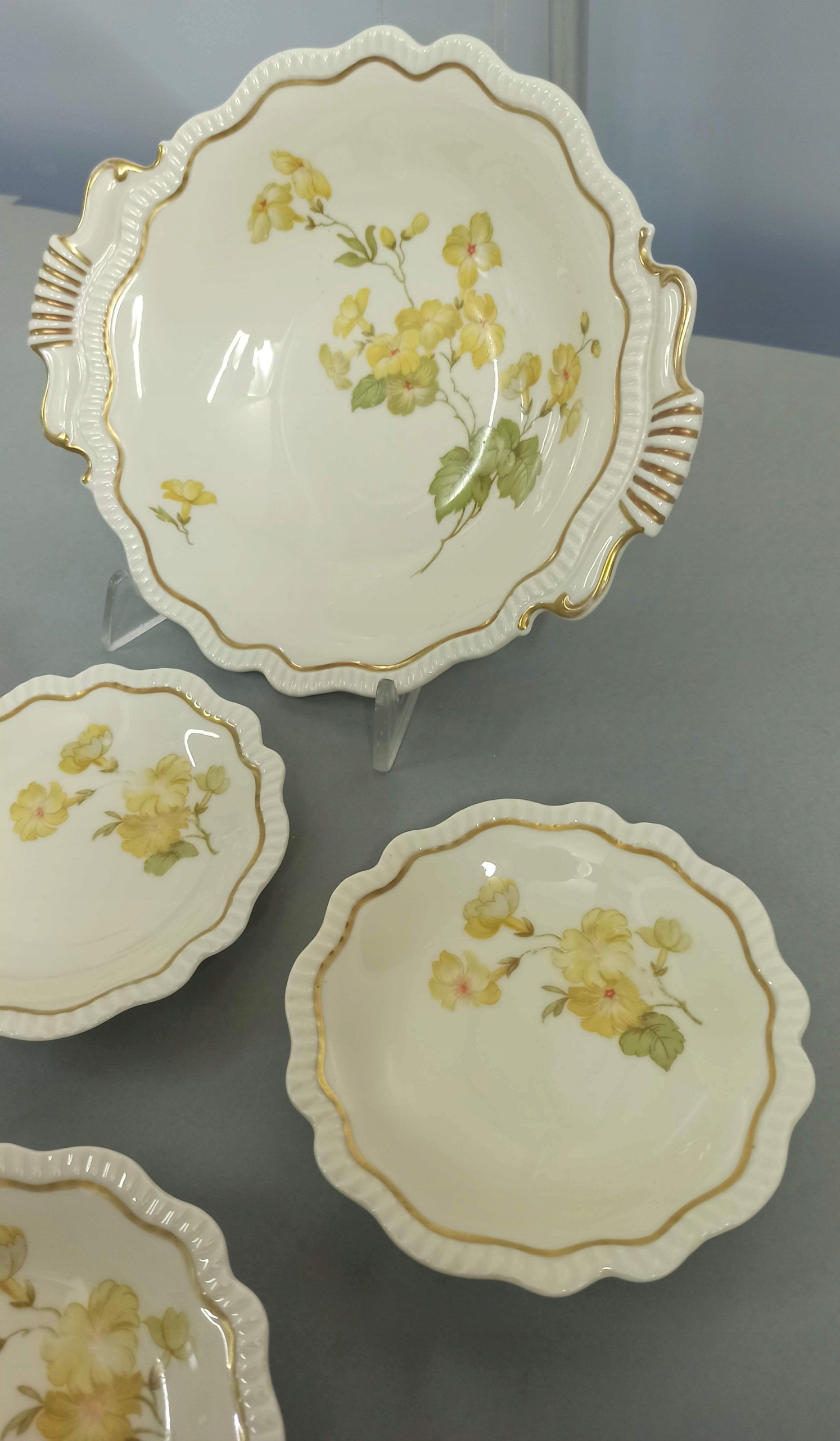 Благородну порцеляну кольору слонової кістки прикрашали жовті квіти. Ручки та окантовка тарілки й тарілок покриті золотом.