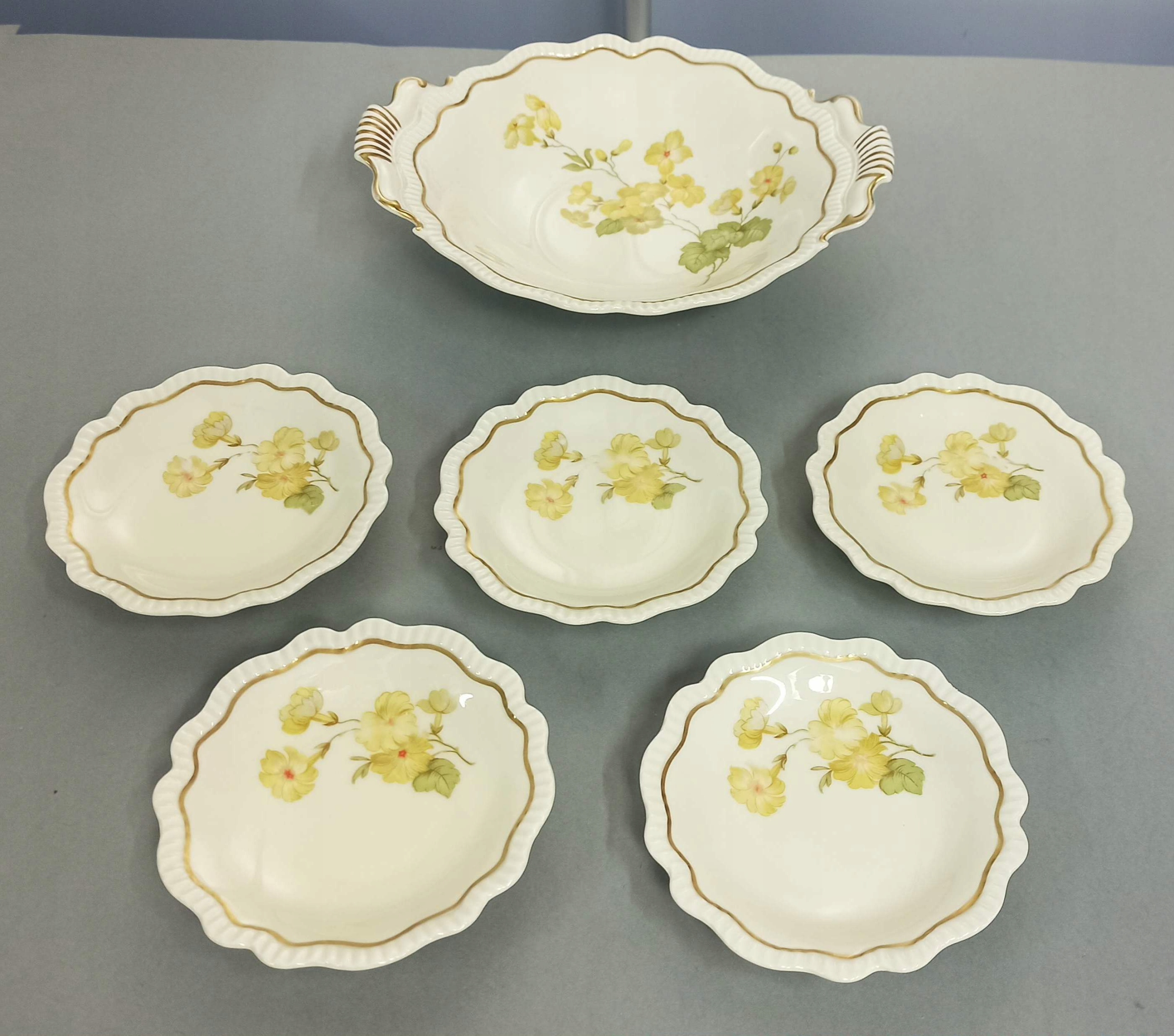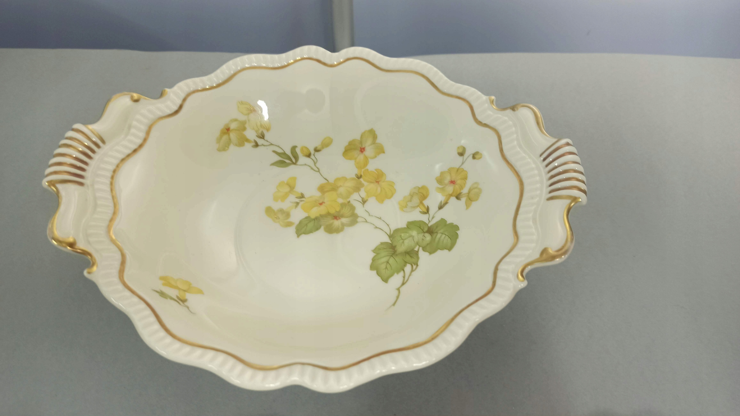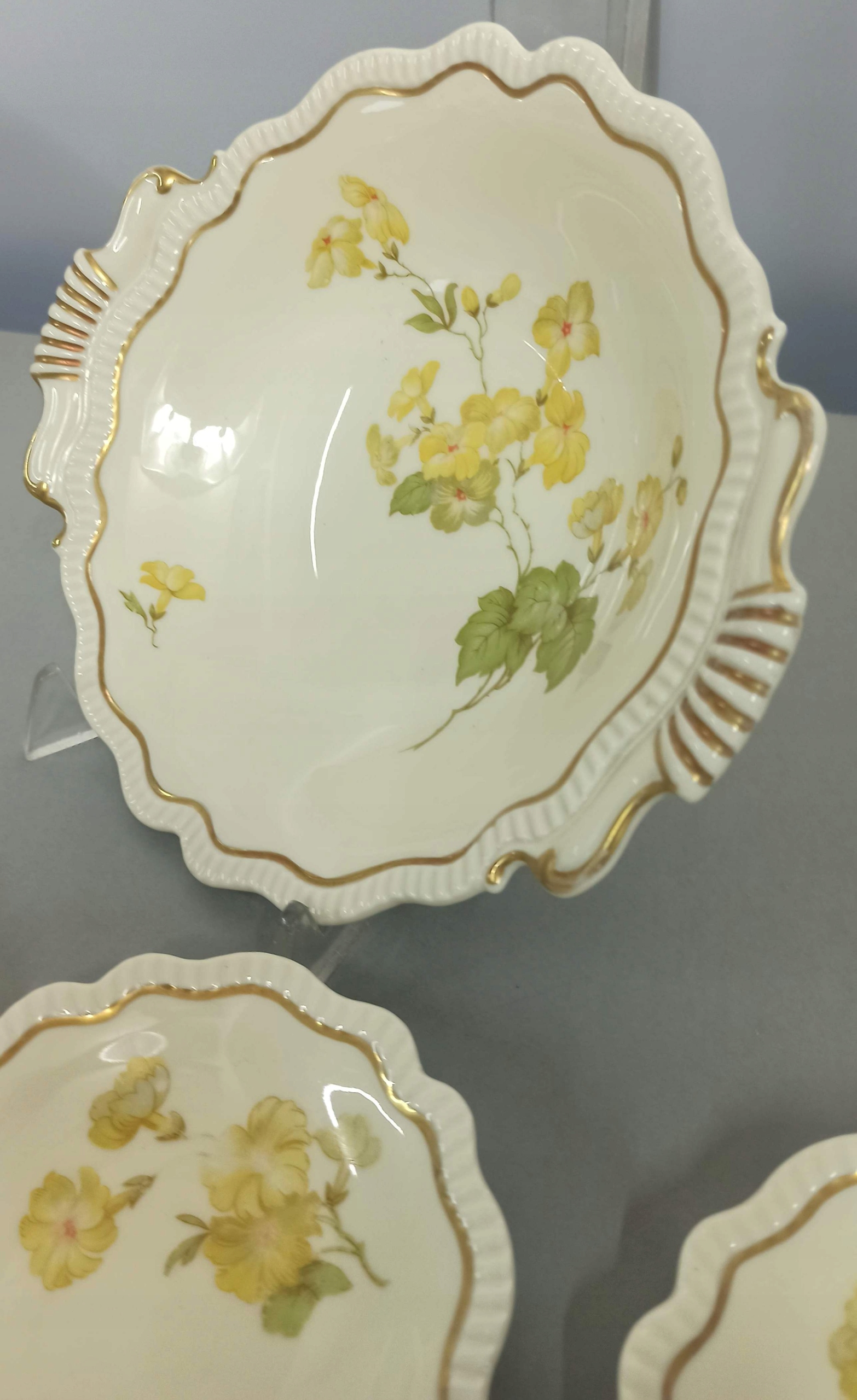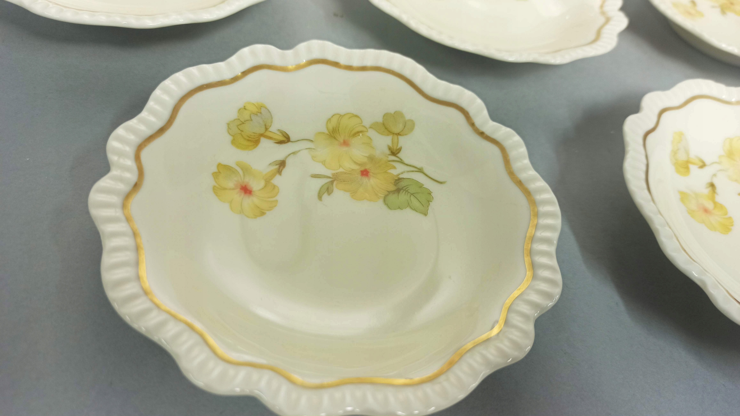 Благородну порцеляну кольору слонової кістки прикрашали жовті квіти. Ручки та окантовка тарілки й тарілок покриті золотом.