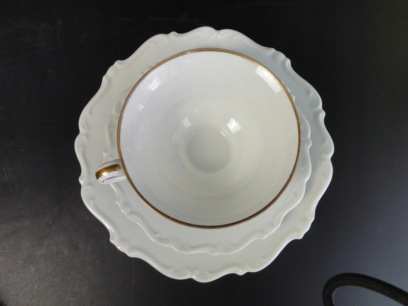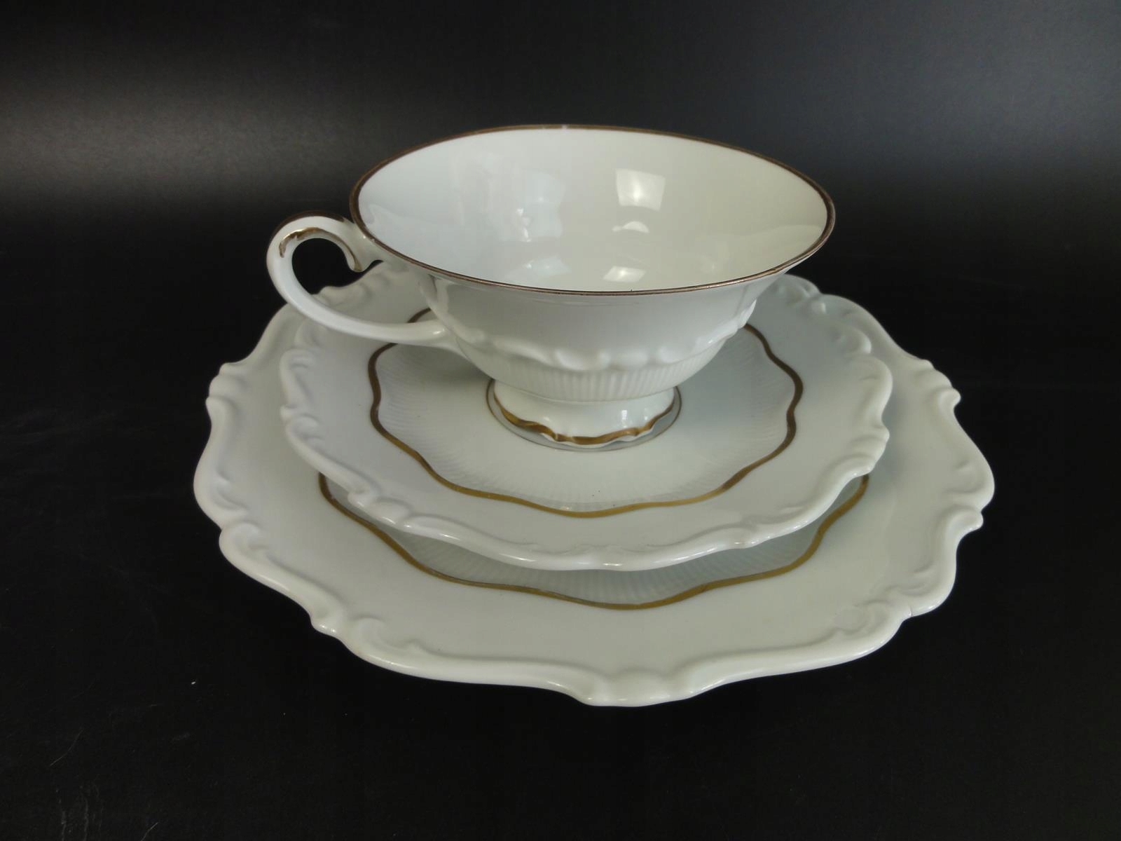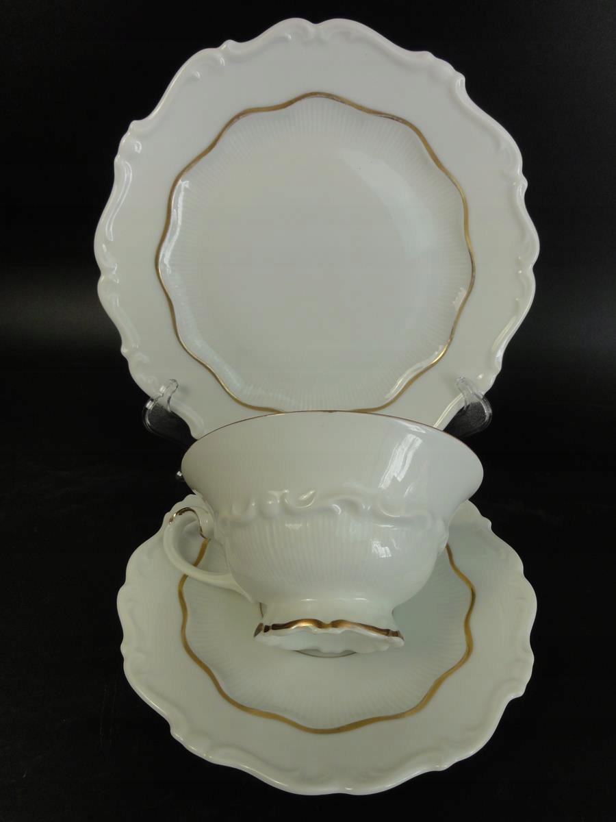 Виготовлений з білої порцеляни, декорований рельєфом та позолотою. Розміри: чашка - висота 5,7 см, діаметр 11 см, місткість 175 мл, блюдце - діаметр 15,8 см, десертна тарілка - діаметр 20 см.