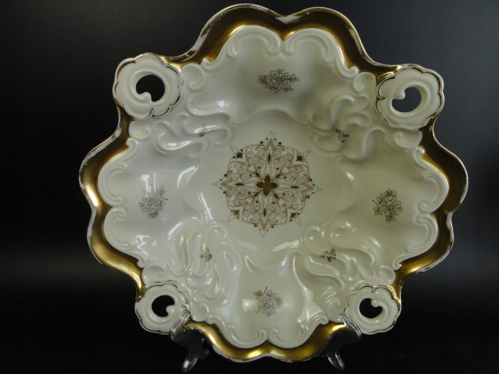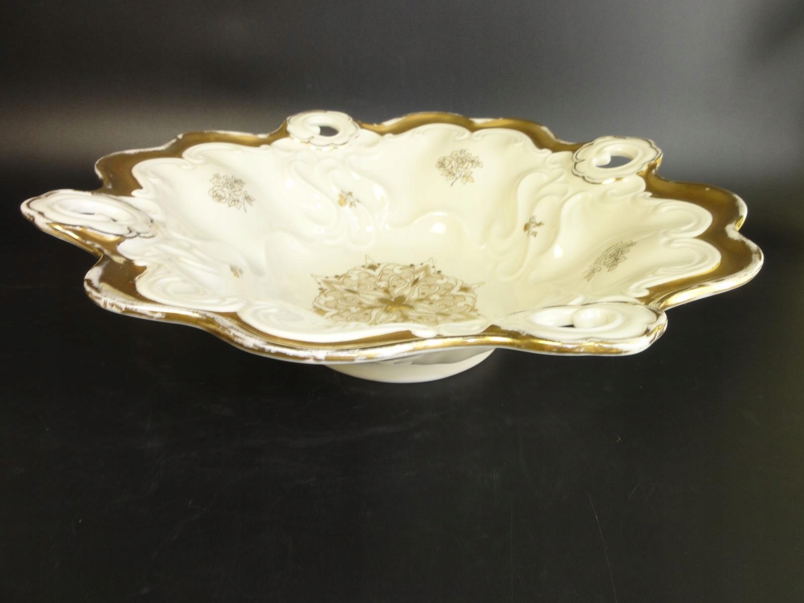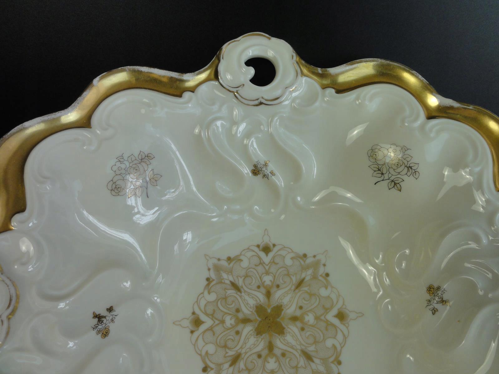 Велика тарілка фабрики Carstens у Сорау, Жари, виготовлена з порцеляни кольору екрю з ажуром, оздоблена рельєфами та позолотою.