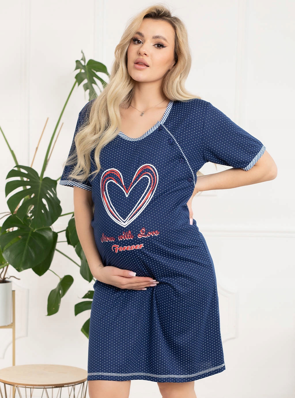 Вагітність і перше Для багатьох жінок дні після пологів - це час, коли важливий не тільки комфорт, але й відчуття привабливості. Дуже цікаво виглядають стильні лікарняні піжами. Витончені білі крапки на темно-синій сорочці для вагітних – ідеальне поєднання. Сорочка має оригінальний принт у формі серця та темно-сині гудзики-сердечка, які чудово доповнюють ціле. Крій нічної сорочки досить вільний, але в той же час не мішкуватий, тому не спотворює фігуру. Довжина до колін дозволяє відчувати себе комфортно як вдома, так і в лікарні.
