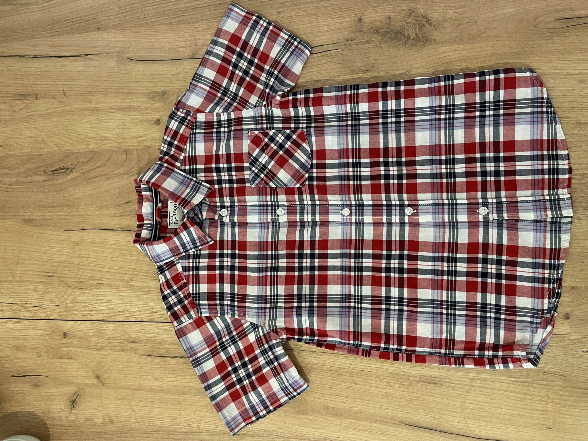 Сорочка з коміром, короткими рукавами, класична клітка. Інтенсивний червоний колір розриває відтінки чорного і білого. Сорочка виготовлена зі 100% органічної бавовни.