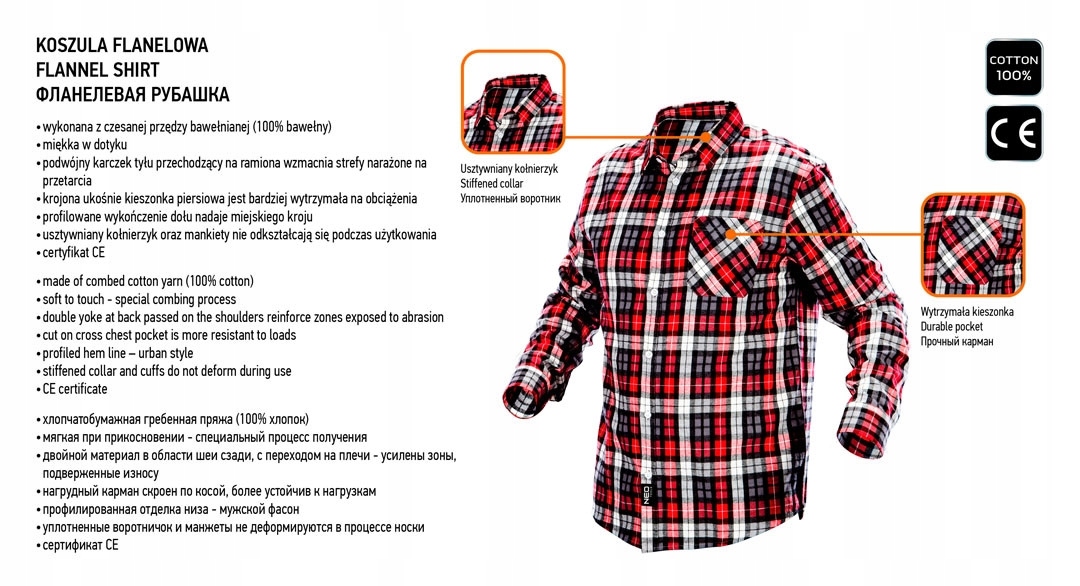Робоча фланелева сорочка NEO (арт. 81-540) виготовлена з чесаної бавовняної пряжі (100% бавовна). Завдяки спеціальному процесу чищення вона м'яка на дотик. Подвійна кокетка на спині, що тягнеться до плечей, зміцнює місця, які піддаються стиранню. Виготовлена з тканини, що не мнуться, завжди виглядає добре. Діагонально вирізана нагрудна кишеня більш стійка до навантажень. Передня складка забезпечує стабільність петель і полегшує застібання ґудзиків. Профільована обробка низу надає міського крою. Посилений комір і манжети не деформуються під час використання.