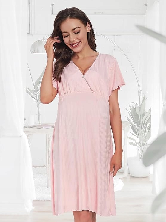 - Застібка на ґудзиках спереду нічної сукні для годування дозволяє легко відкривати та закривати, що дозволяє непомітно годувати грудьми Гладкий, дихаючий і м'який матеріал, приємний до шкіри, його також можна носити як звичайну нічну сорочку після вагітності та годування груддю високий рівень комфорту. Ця нічна сорочка для вагітних — ідеальний нічний одяг для годуючих мам.