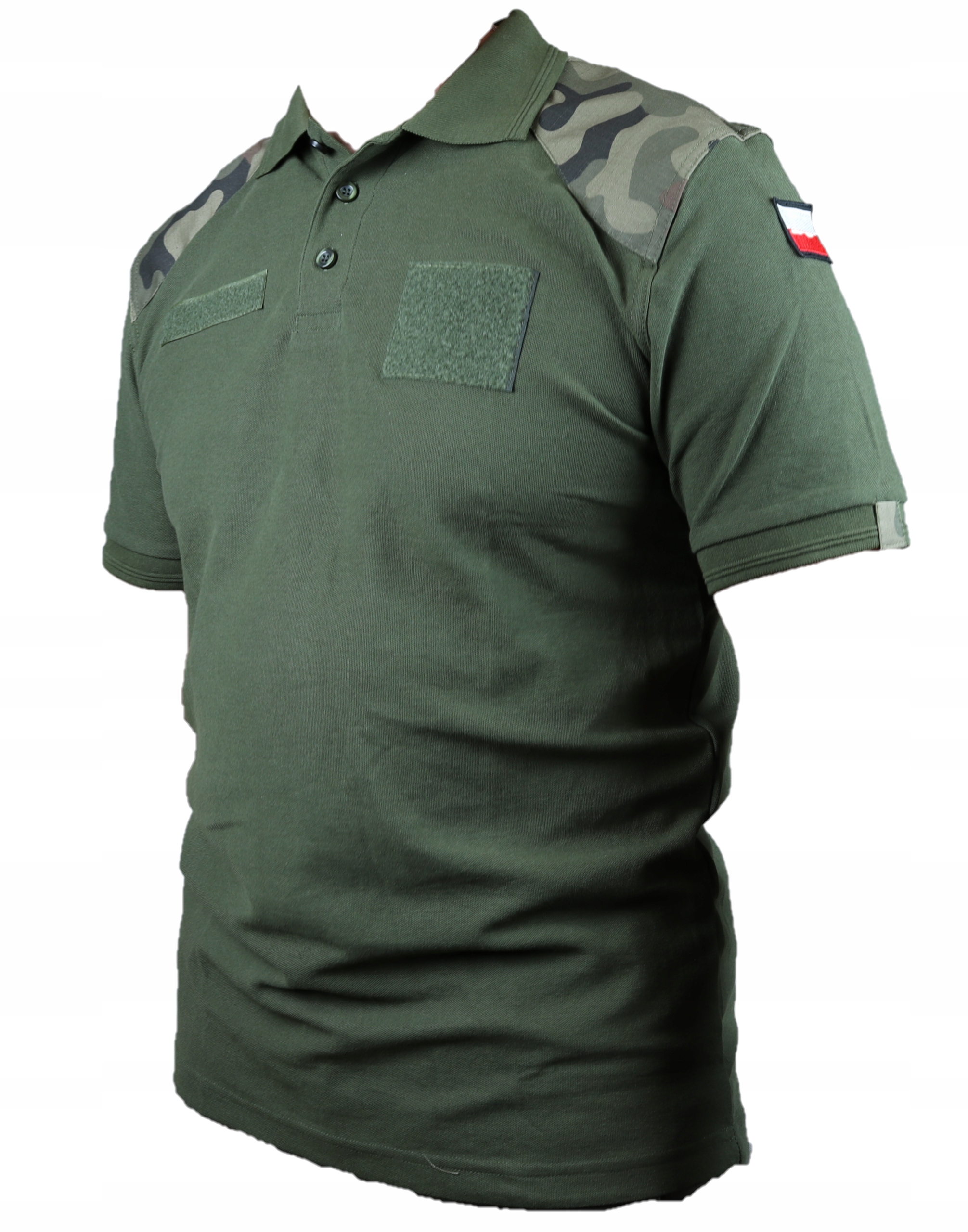 сорочка поло Війська Польського кольору хакі з камуфляжним візерунком 93 вставки на плечах .на рукавах є липучки для прапорців, ще дві липучки на грудях.
